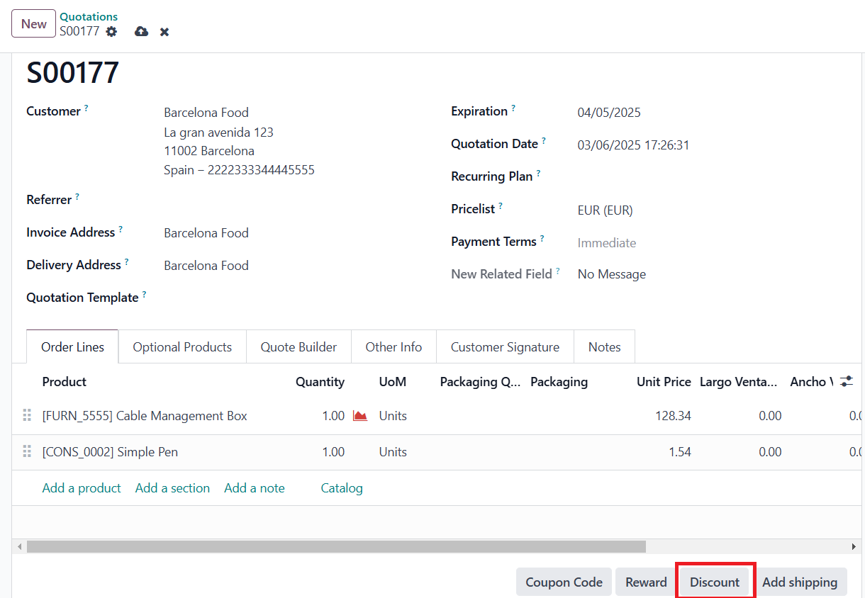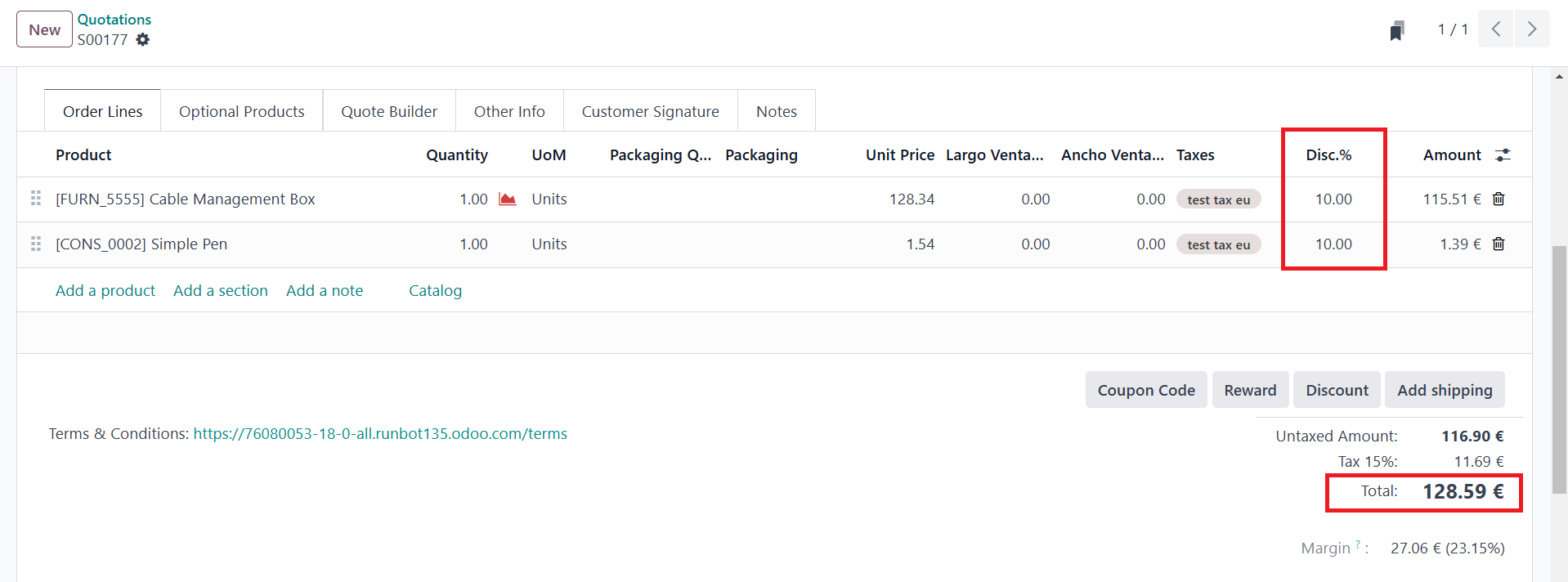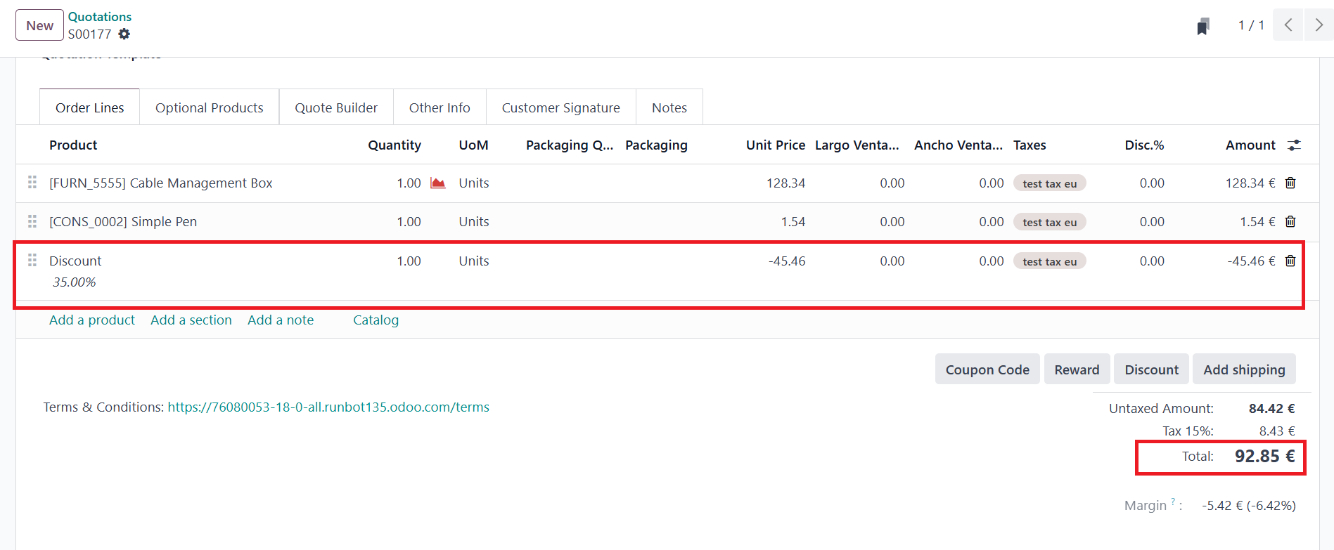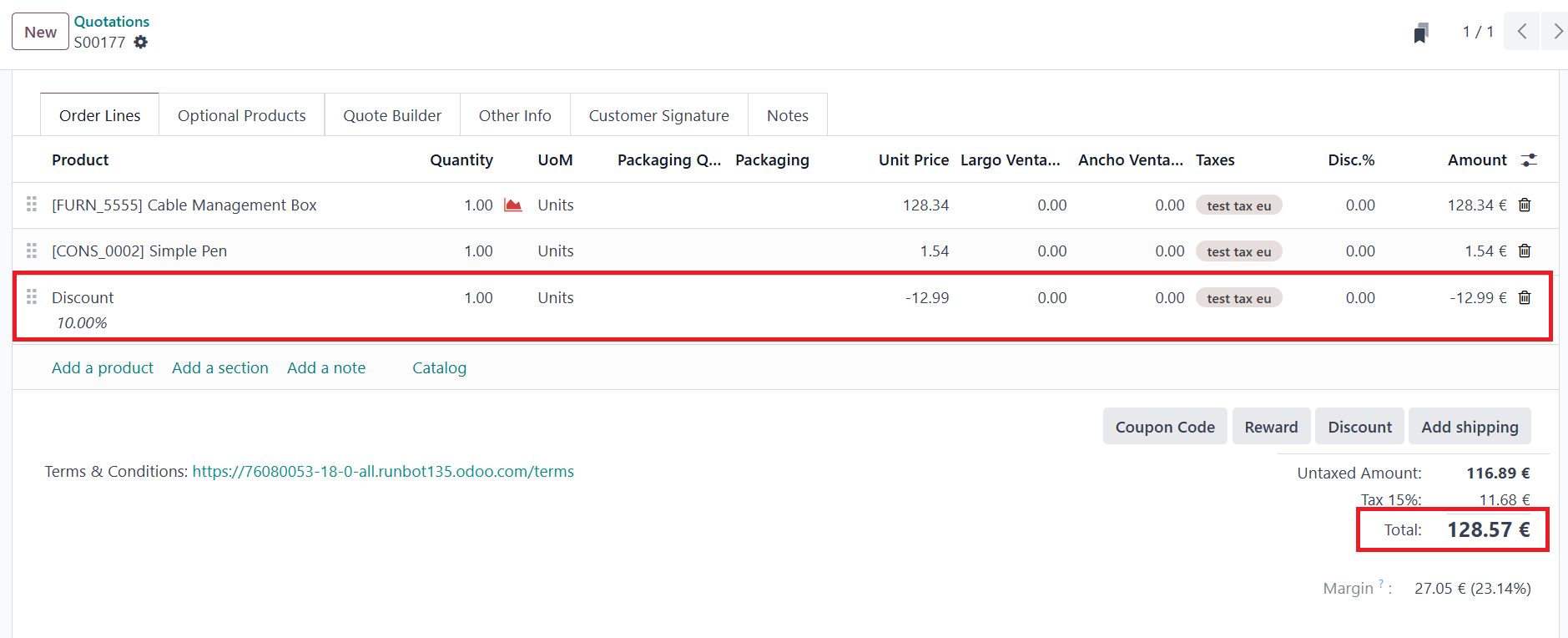 Once applied, Odoo automatically adjusts the pricing accordingly, and