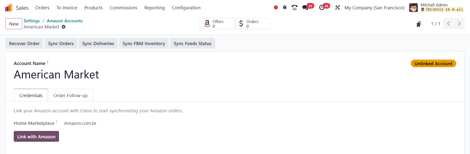 To link an Amazon Seller account in Odoo, click on the Amazon
