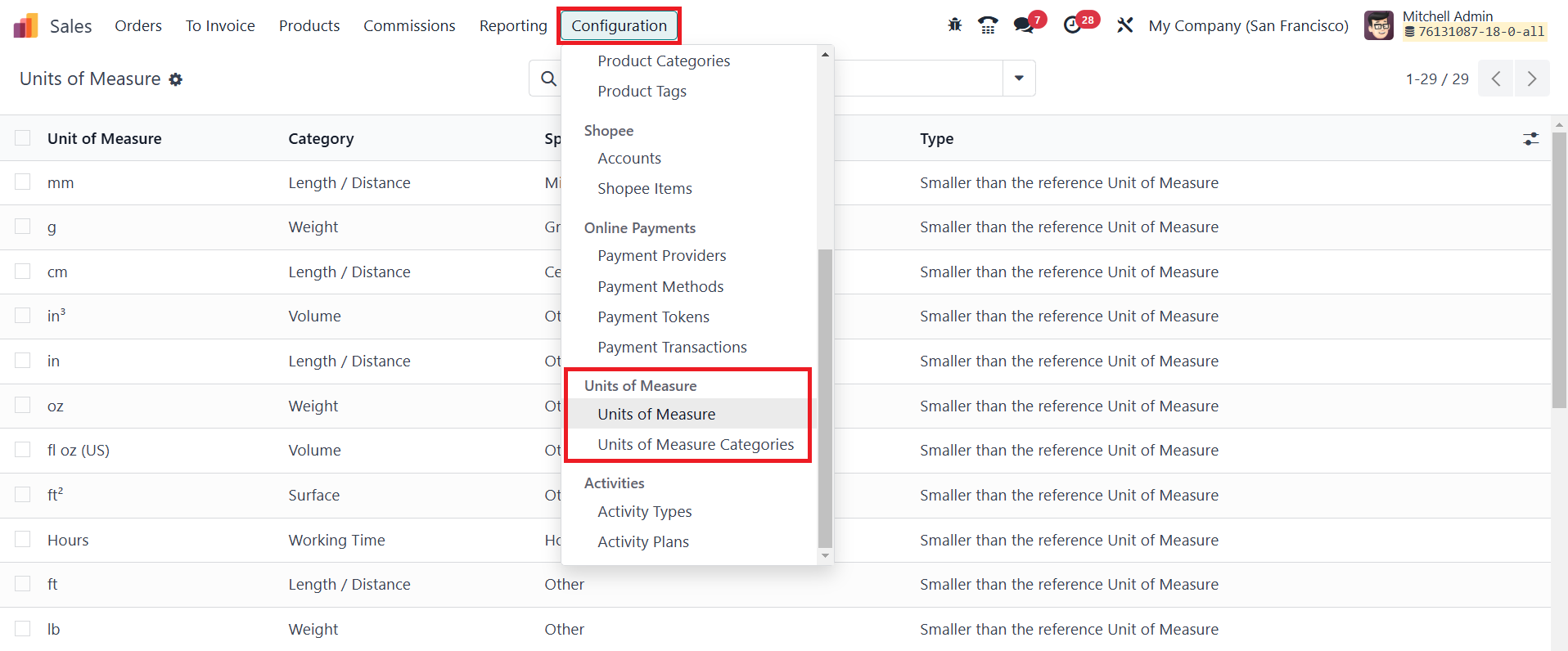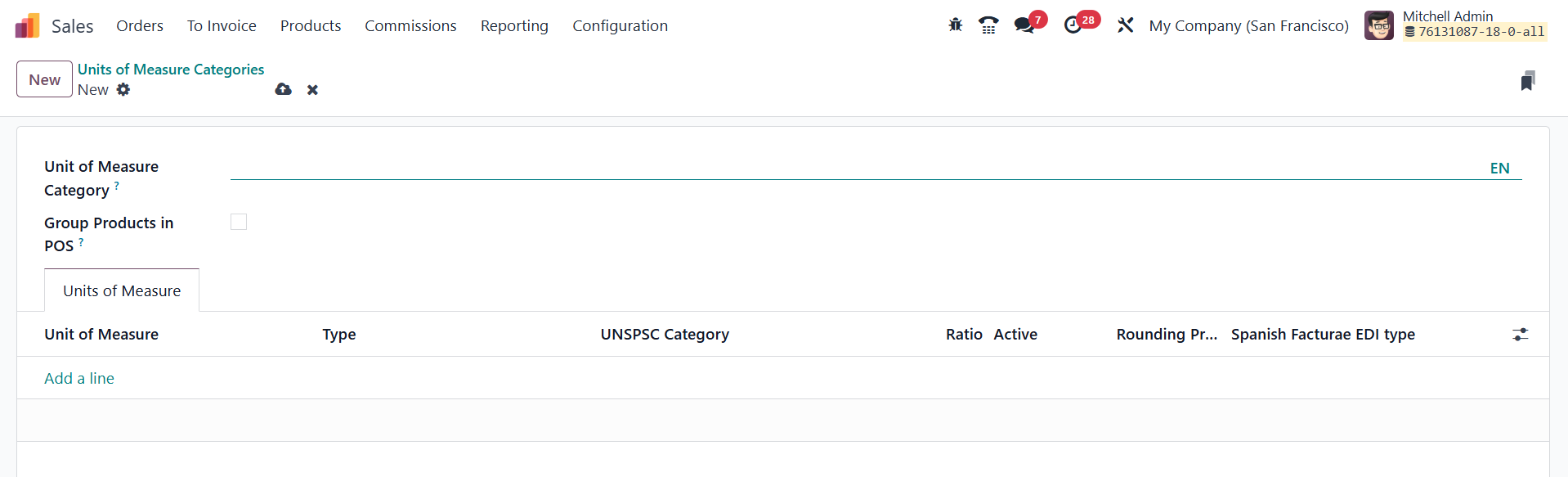 In Odoo 18 Enterprise Sales module, configuring Units of Measure