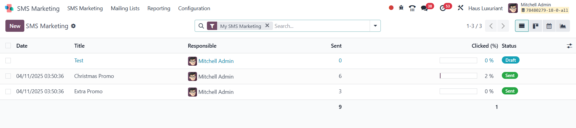 On the SMS Marketing page in Odoo 18, you can monitor your campaigns