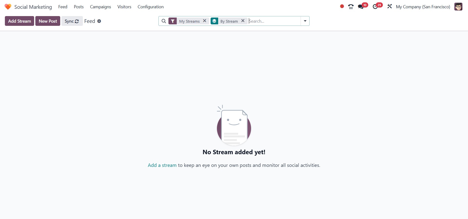 Once your social media accounts are connected, Odoo 18 displays them