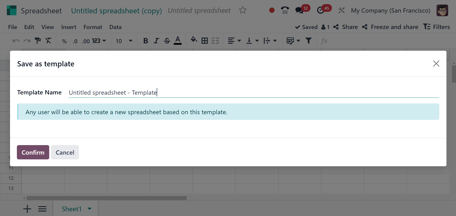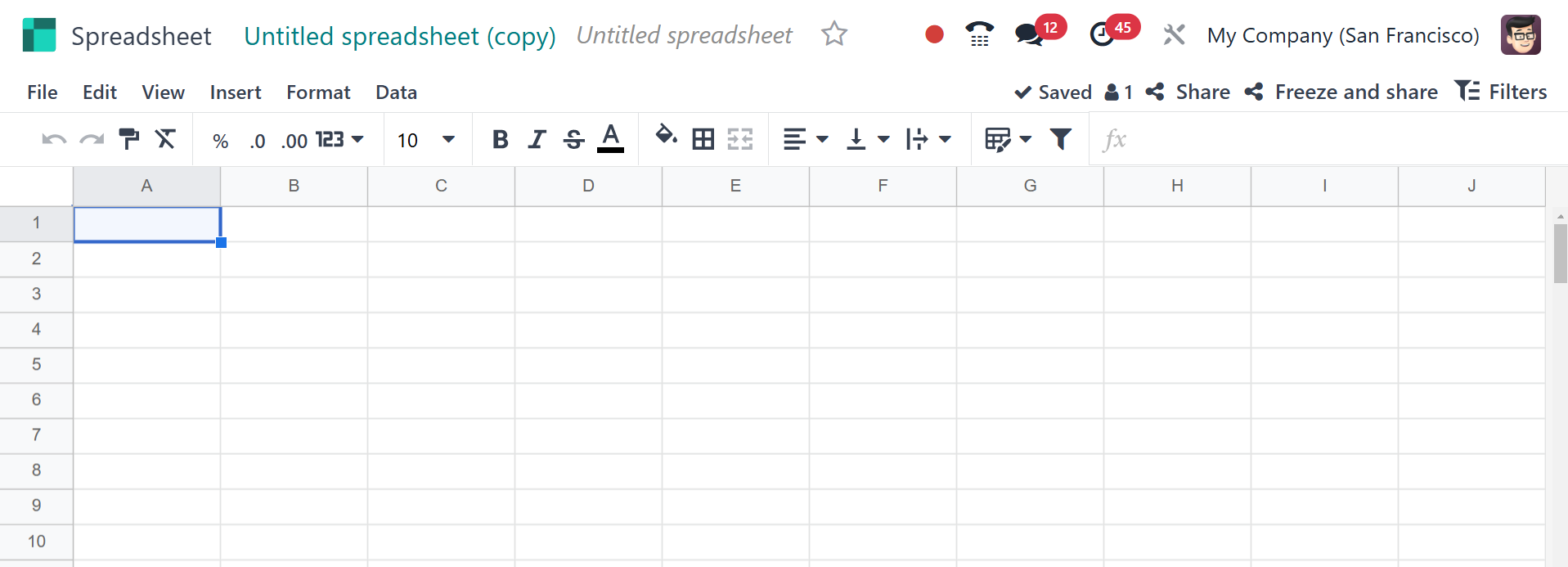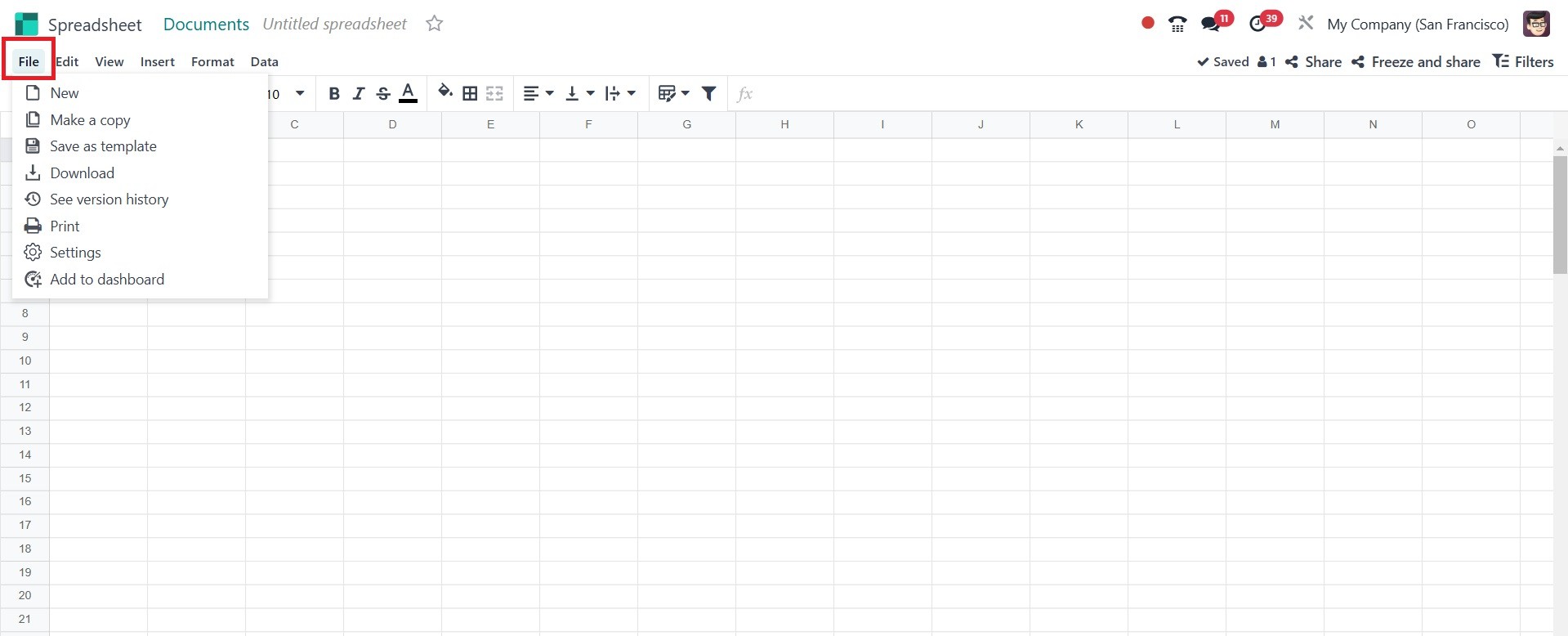 New: Creates a new spreadsheet within Odoo. the newly created page