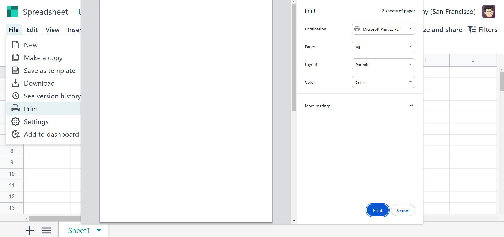 Print: Prints the spreadsheet or specific selections.