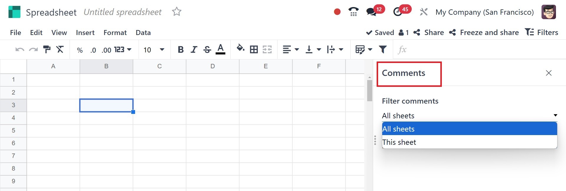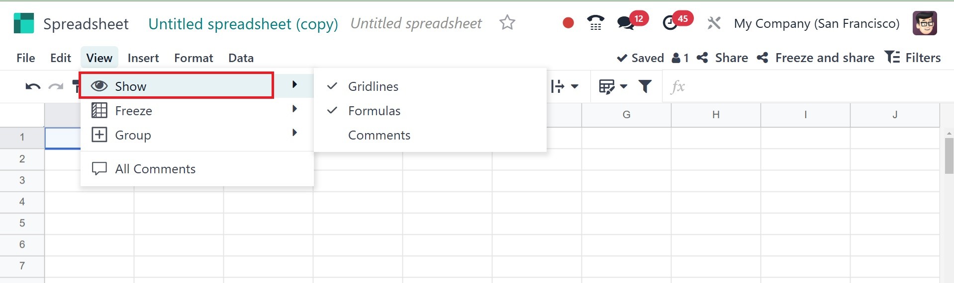 Show: Toggles visibility of cell gridlines, formula, and comments, as