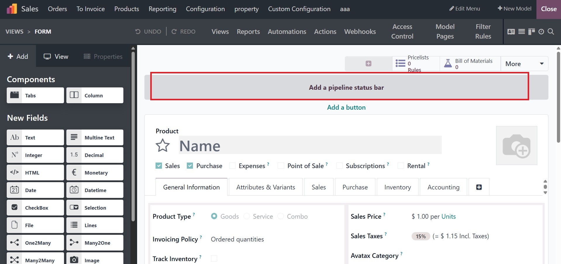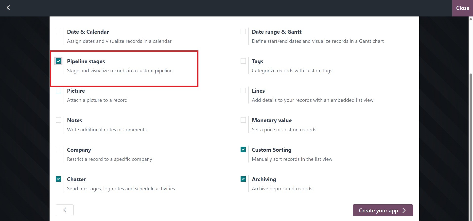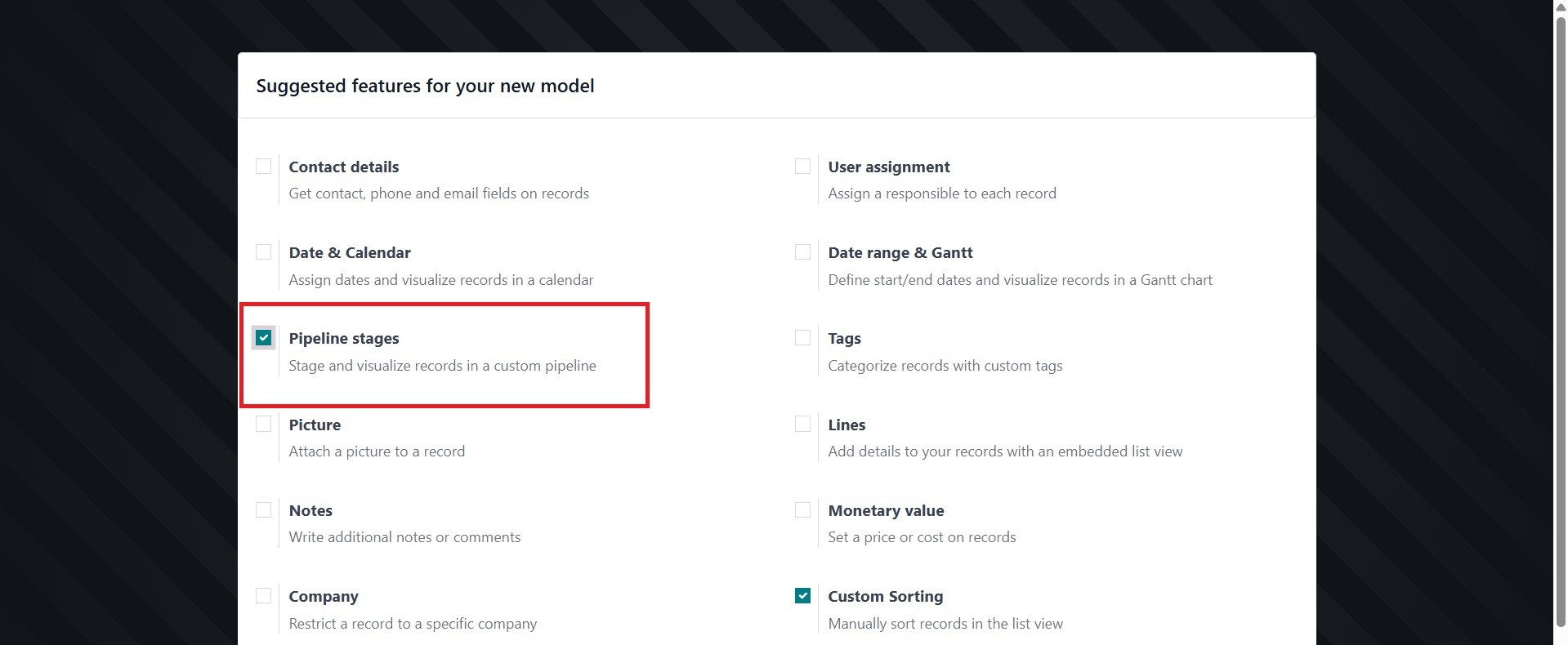 created using Odoo18 Studio has been described, the Pipeline Stages