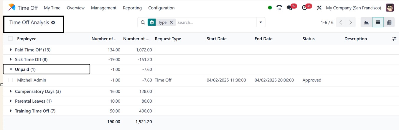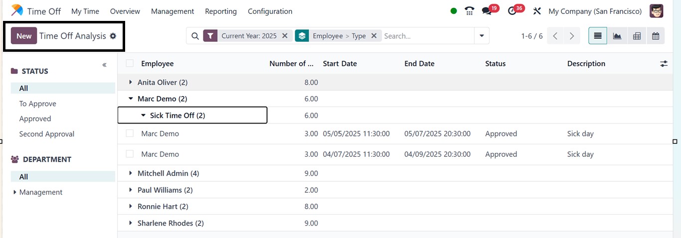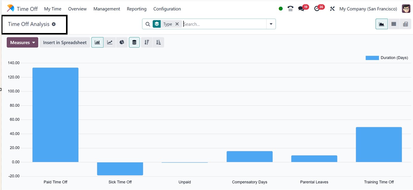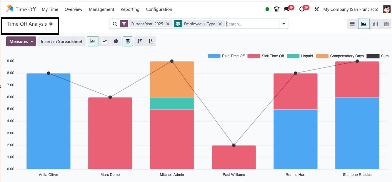 The Time Off Analysis by “Balance" feature in Odoo 18 provides a