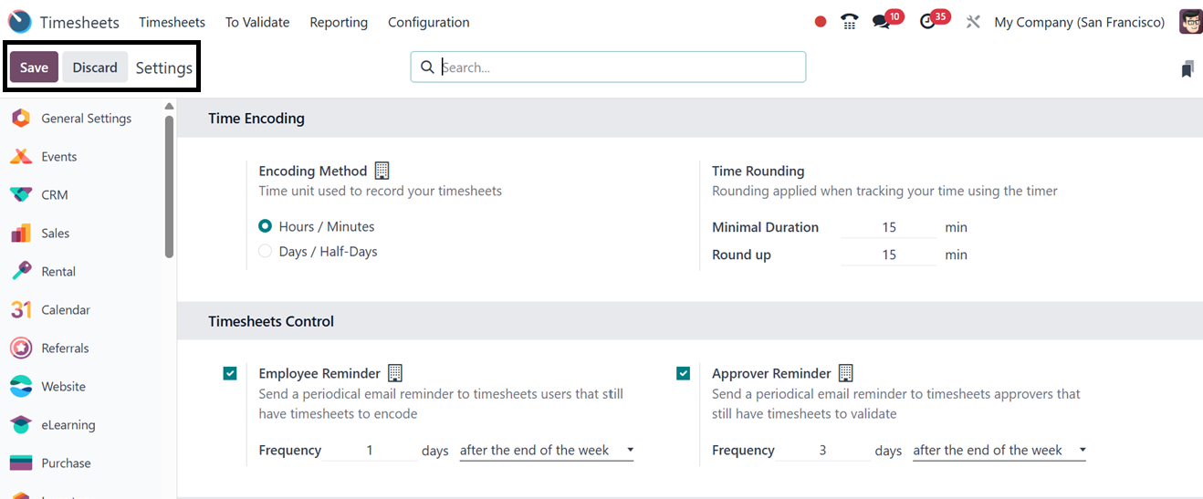 The Timesheet module's 'Configuration' menu provides access to the 'Settings' section,