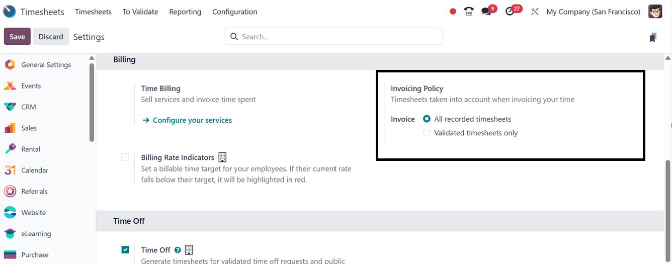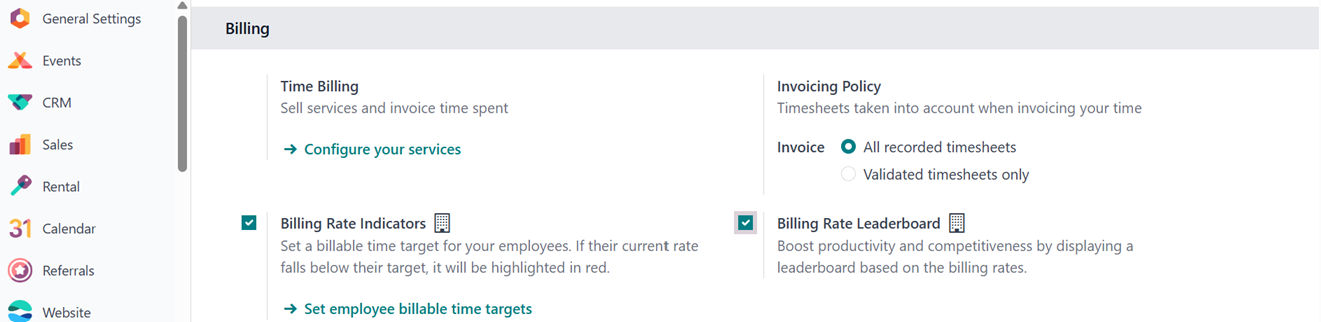 The Timesheet module's "Invoicing Policy" specifies how and when billable hours,