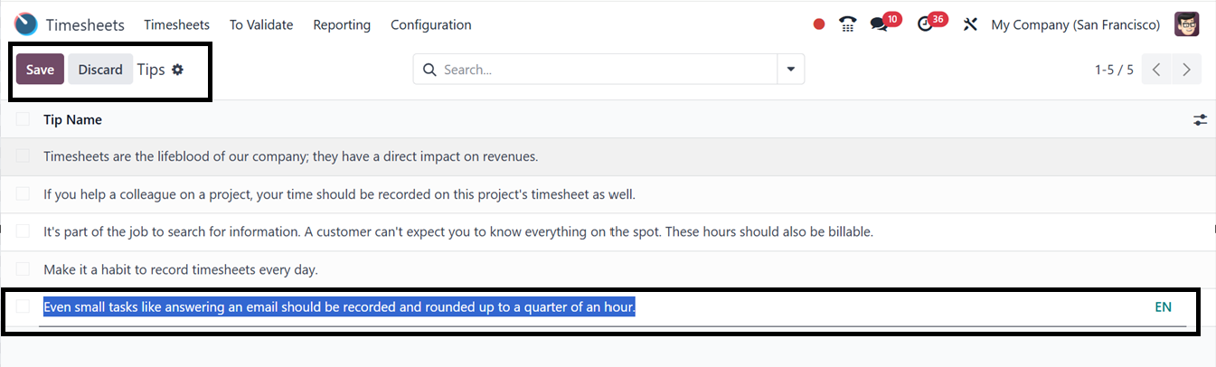 The 'Tips' window in Odoo 18's Timesheet module is a tool for managing and editing