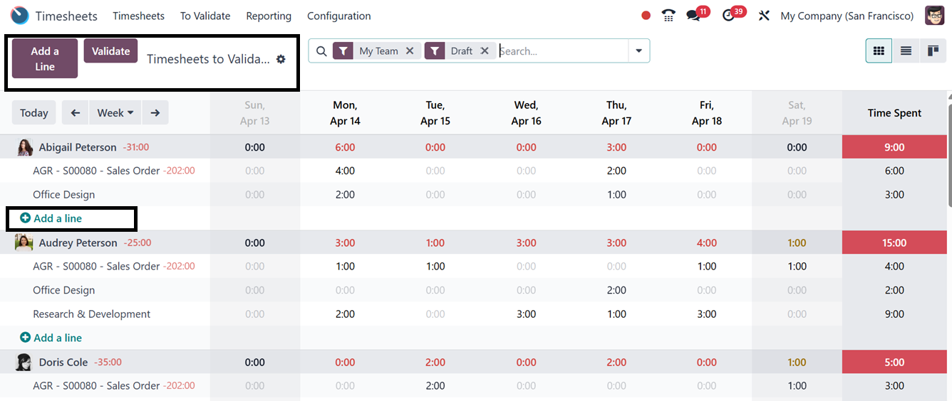 The ‘Add a Line’ button in the window allows you to create a new timesheet entry,