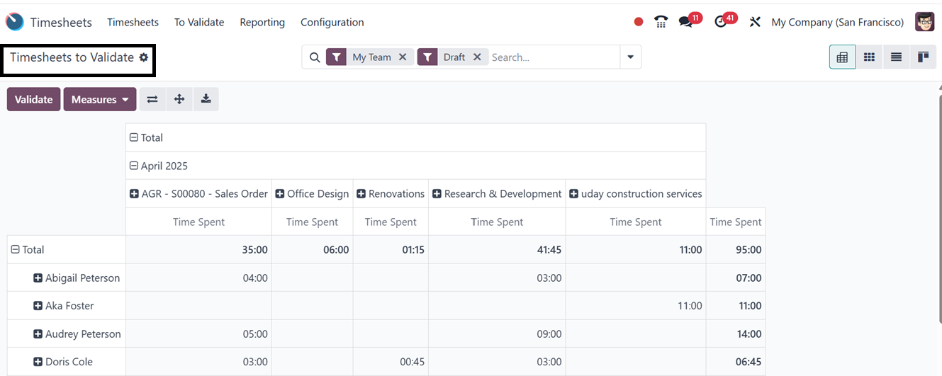 The 'To Validate' menu in the Timesheet module enables company managers to review
