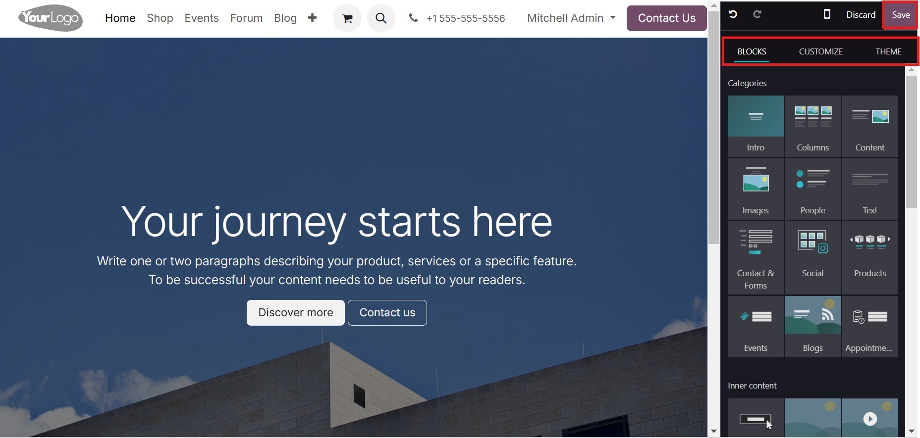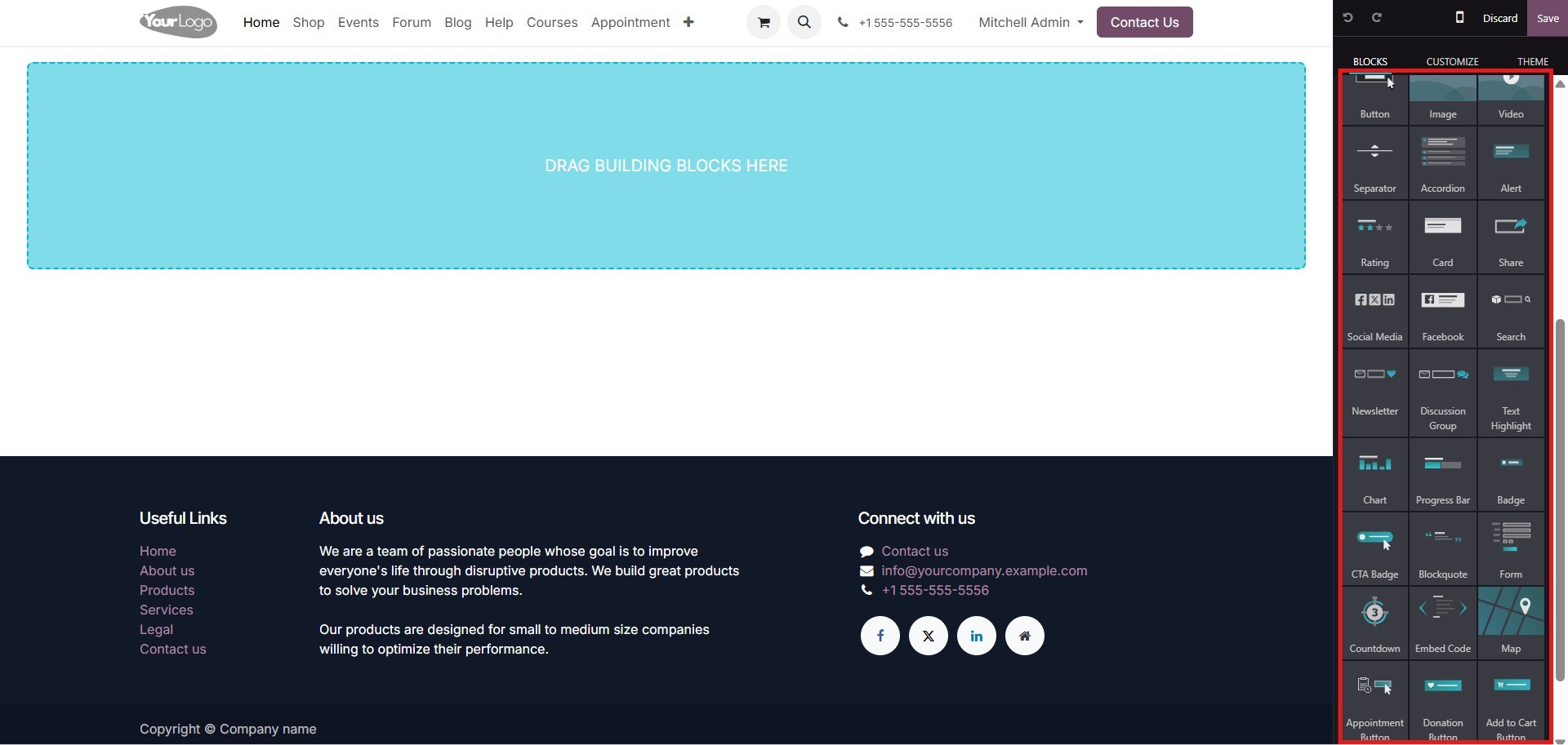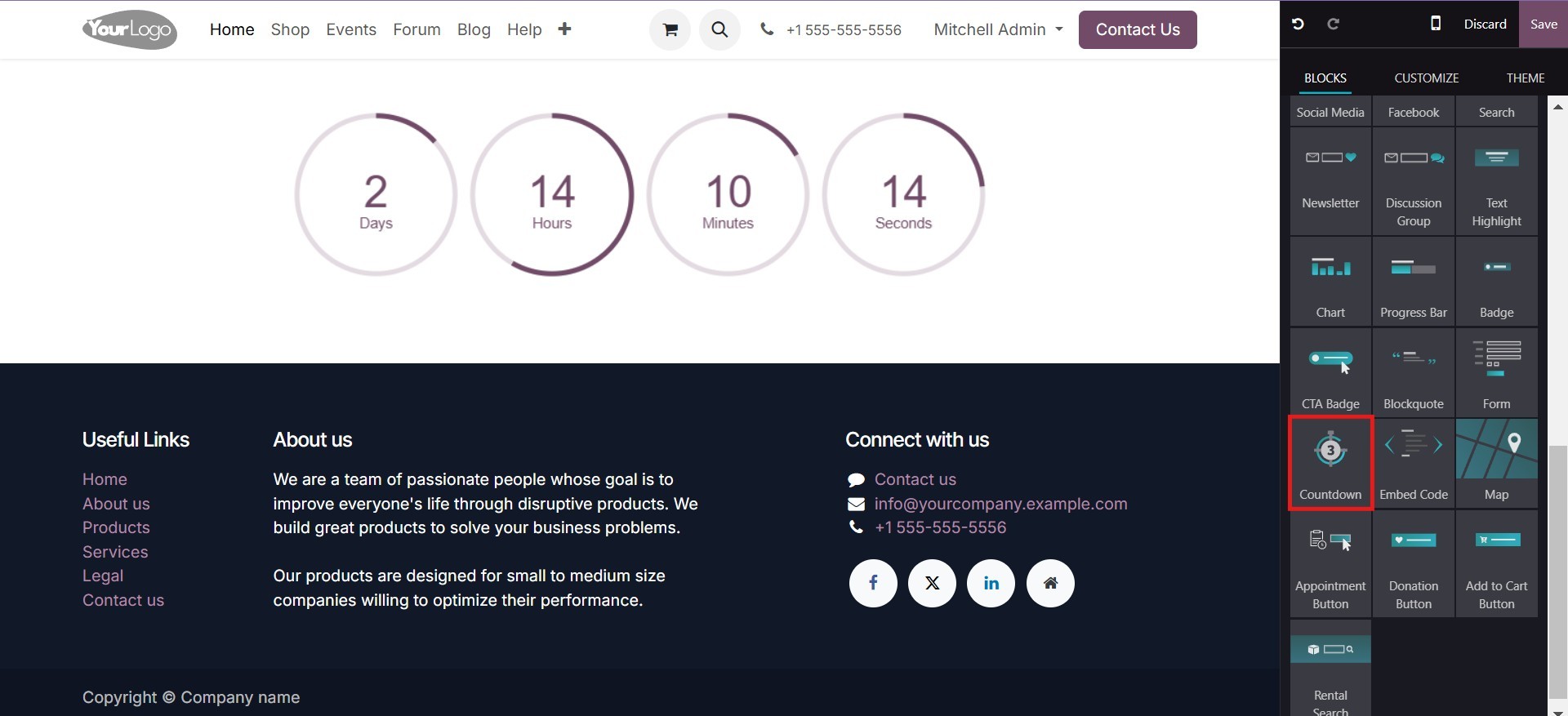 - Timeline Snippet: The Timeline Snippet within the Odoo Website