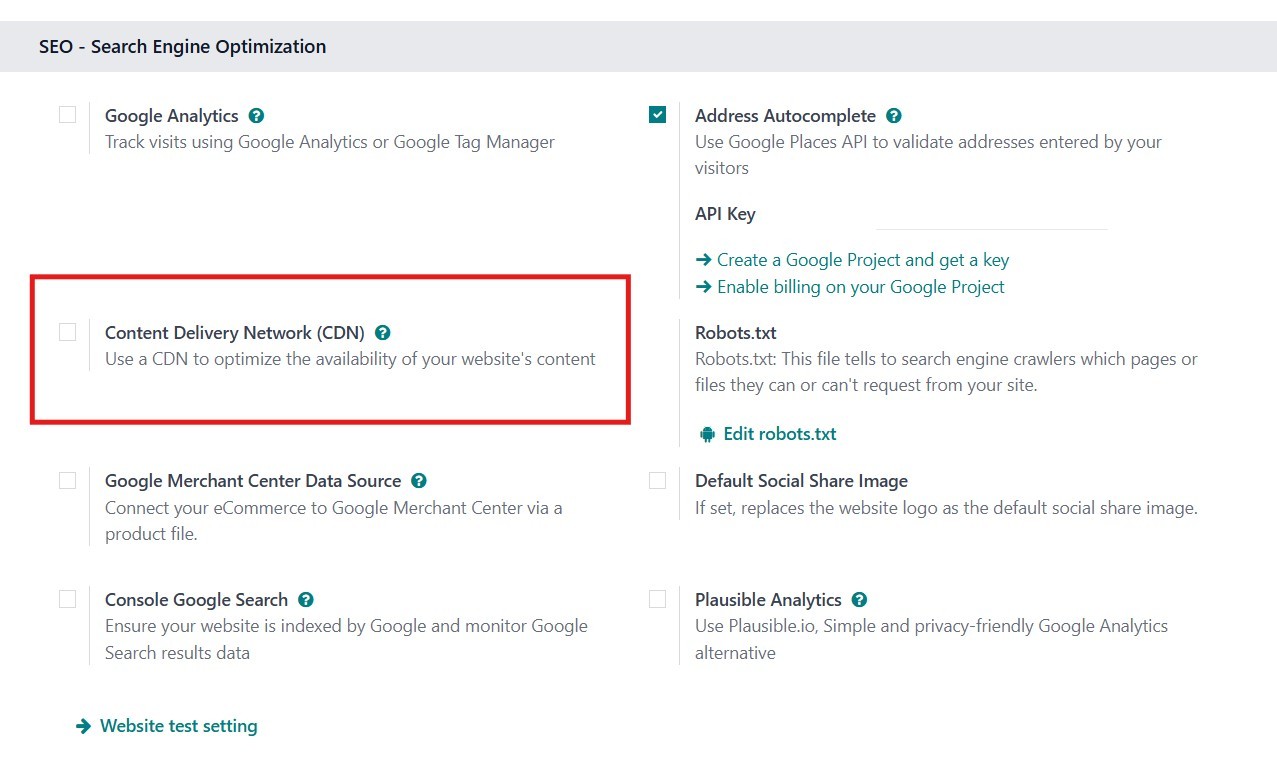 Under the SEO section in the Odoo Website Settings, various tools are