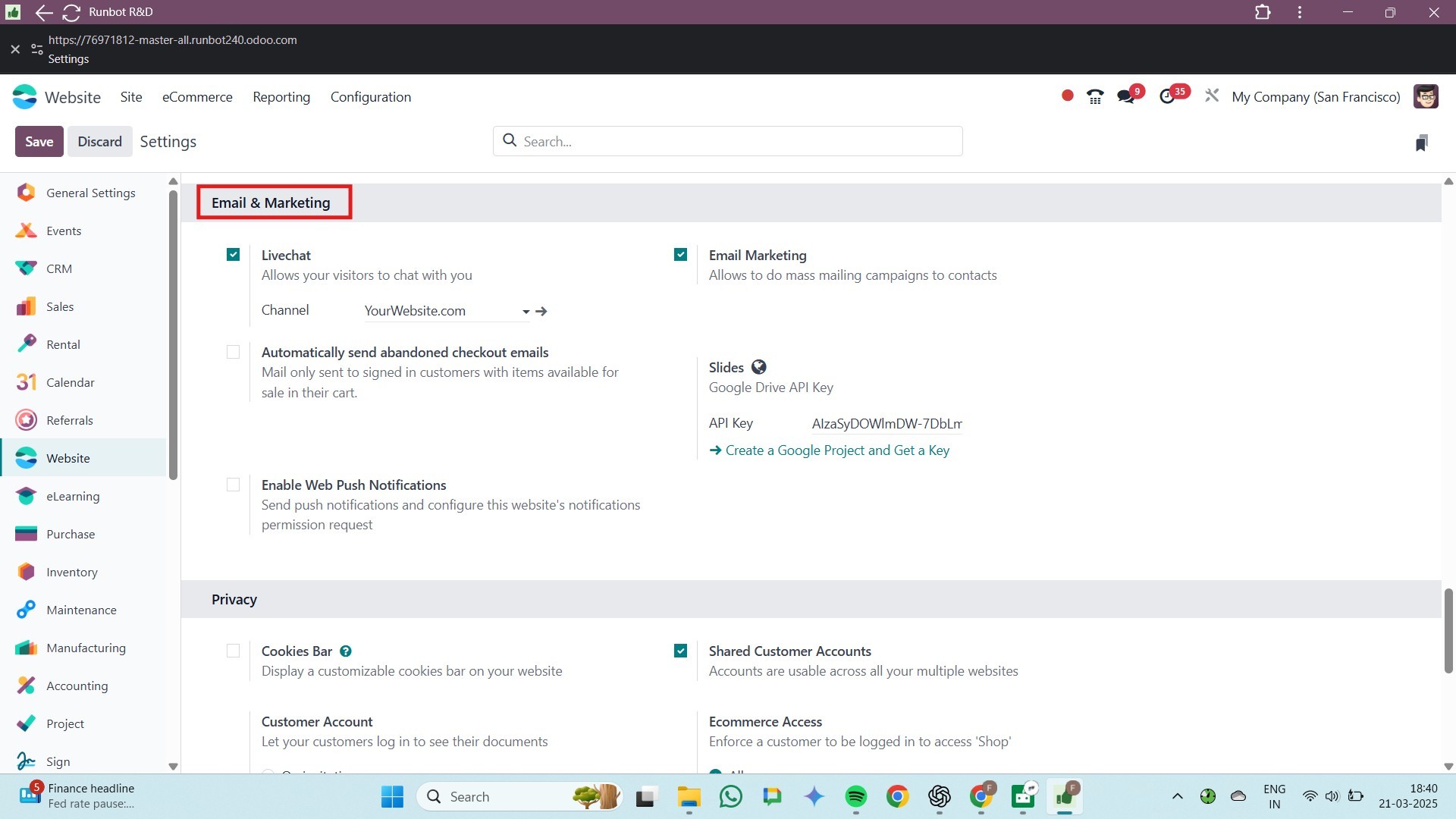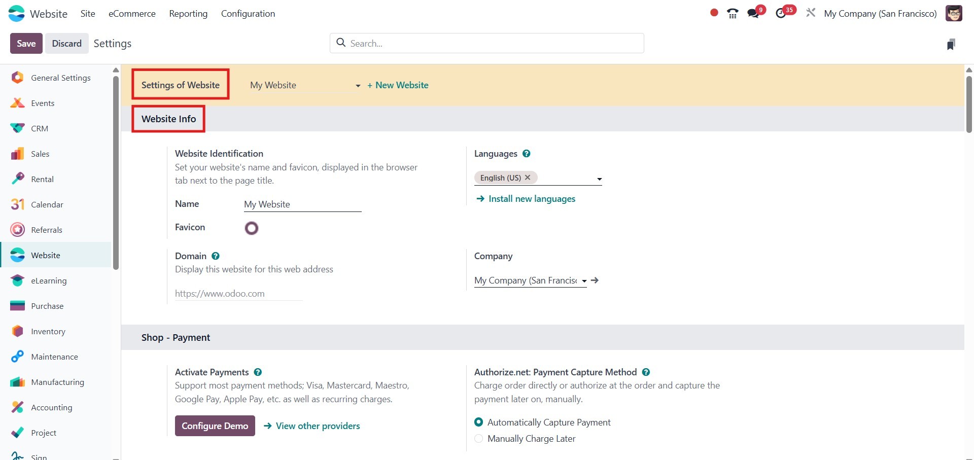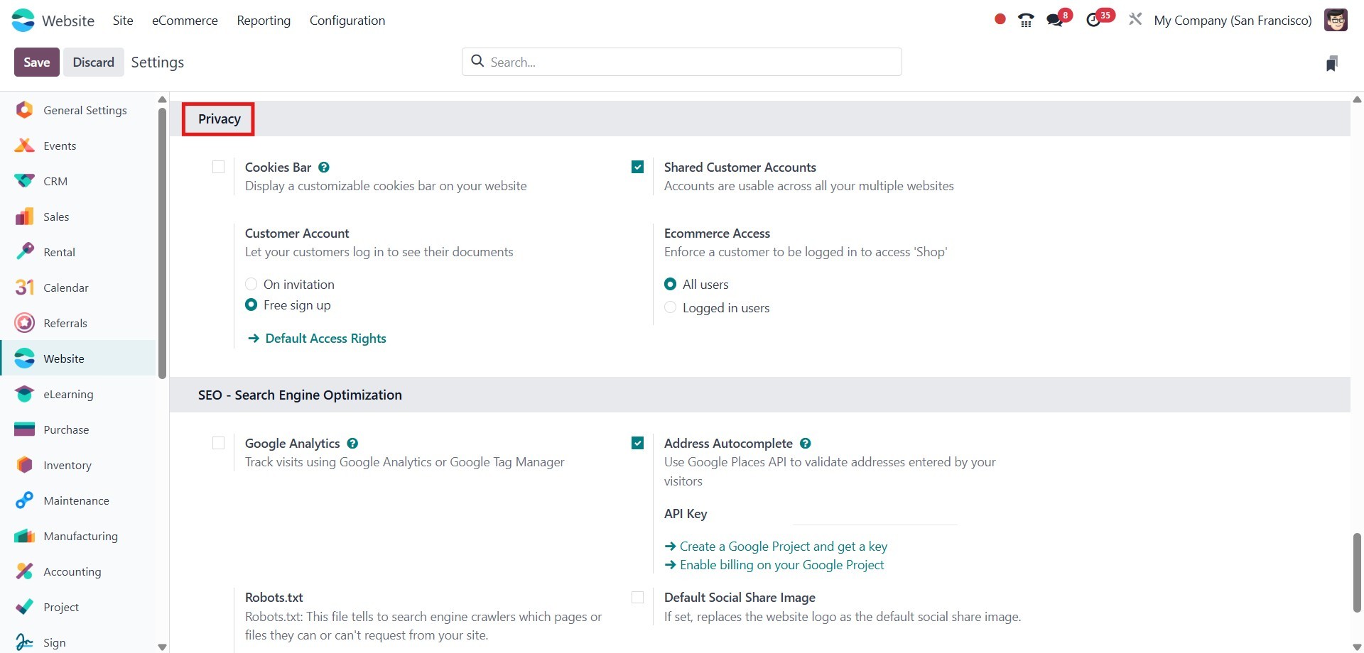 The Settings panel in the Website module provides several