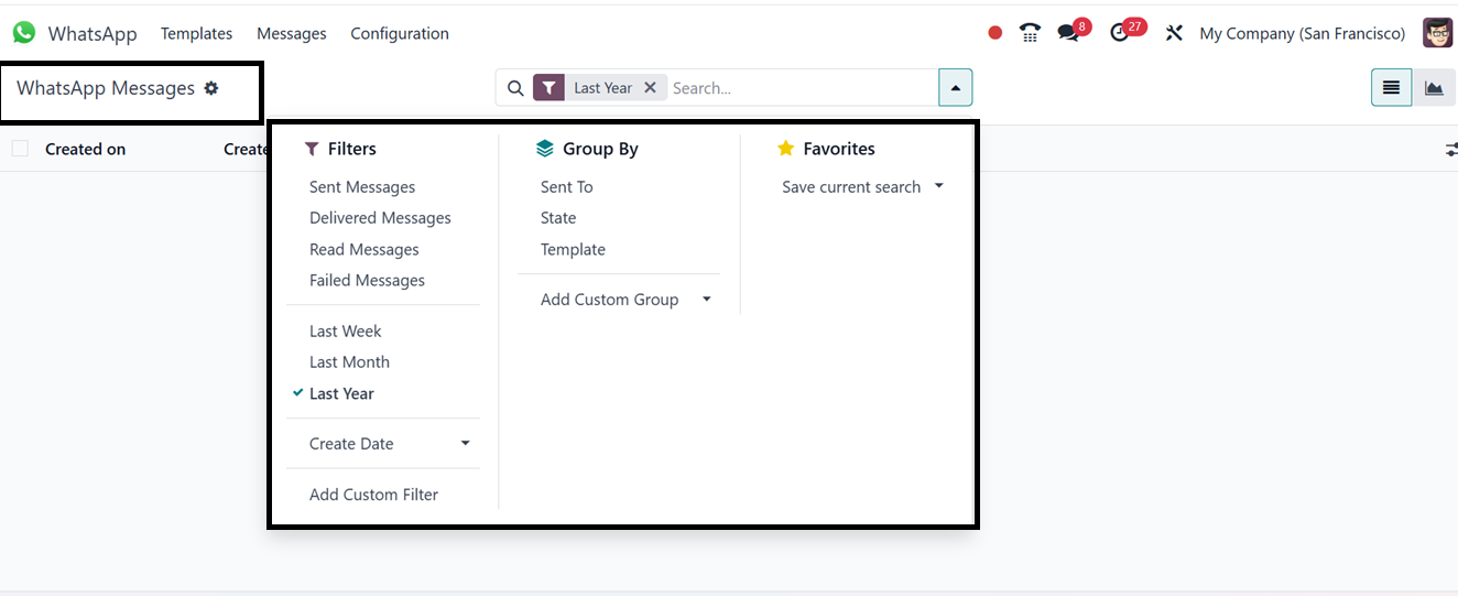 The ‘Messages’menu of the WhatsApp module in Odoo 18 provides