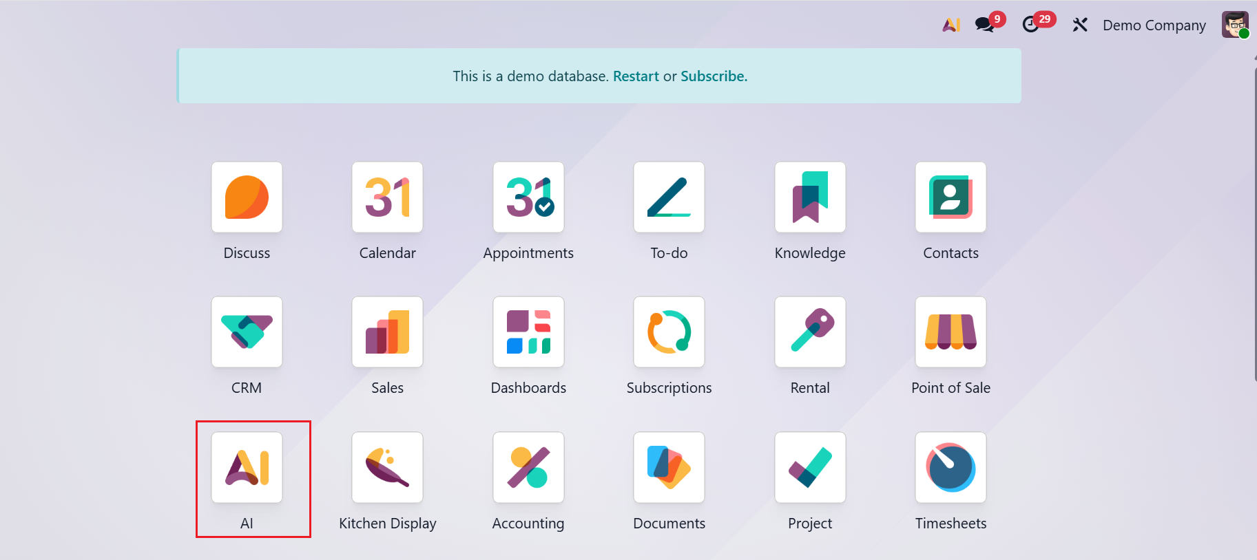 In the screenshot below, the AI module is displayed on the Odoo dashboard.