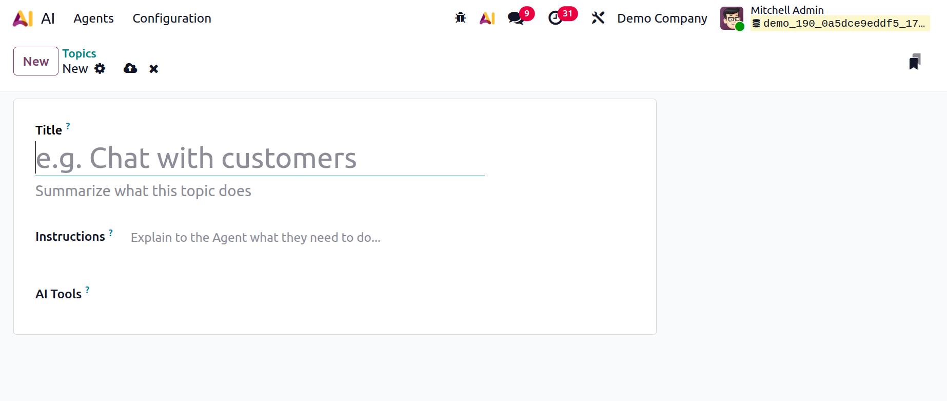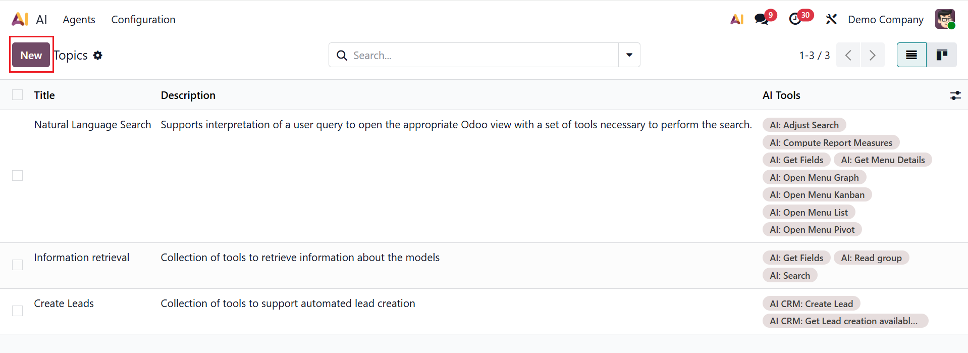 In Odoo 19 Enterprise AI, the Topics option is a collection of instructions that lets you clearly specify which subjects the AI may discuss and tell the agent what, when, and how to do it. It keeps AI responses pertinent, appropriate, and consistent with the chosen functional domain. Here you can see the details of the topics, including Name, Description, and AI Tools. To create a new topic, click on the New button as shown below: