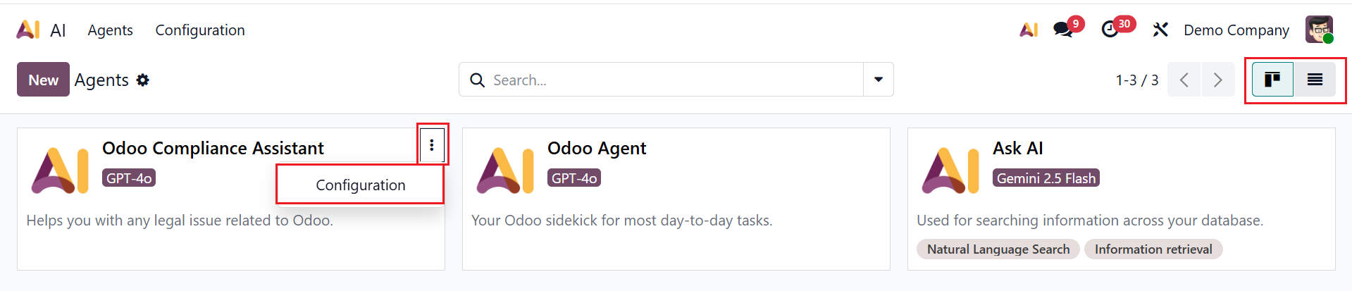By default, you can see the Agents option as the AI module's dashboard view. Here, each agent is arranged as a kanban card. You can also switch to List view. To make changes to an existing AI agent, click the three-dot menu in the top-right corner of the card and select the Configuration option as shown below: