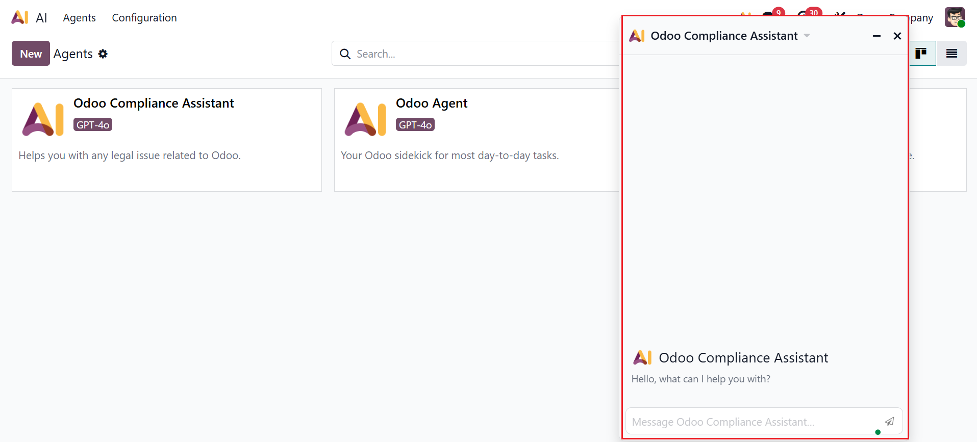 Here, the AI module consists of two menus: Agents and Configuration.