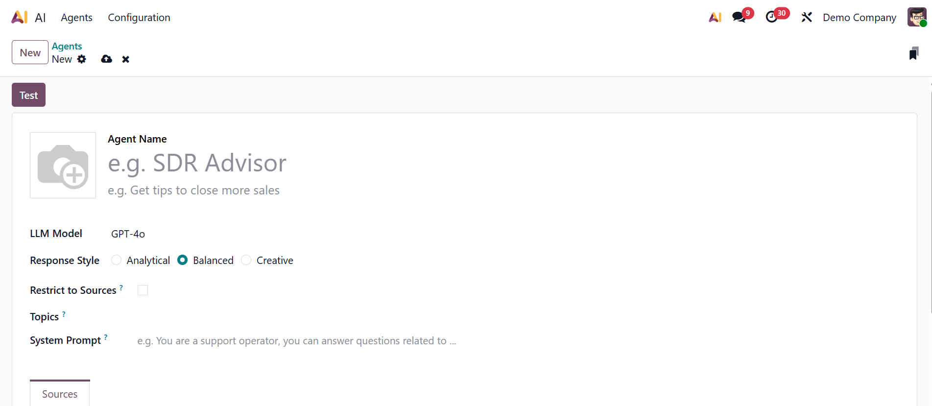Click the New button to create a new AI agent. Here, add an Agent Name and add a short note if needed. From the drop-down menu, select an LLM Model. In the Response Style field, you can define how the AI responds to users, including tone, length, and level of detail. Select the response style as either Analytical (gives logical, data-driven, and structured responses focused on accuracy and reasoning), Balanced (provides clear and neutral responses with a mix of analytics and creativity), or Creative (produces imaginative, expressive, and engaging answers). Enable the Restrict to Sources field to allow the agent to respond only to the provided sources. In the Topics field, add instructions and tools that guide Odoo AI in helping the users to complete their tasks. In the System Prompt field, add a set of instructions that defines how the AI should behave and respond.