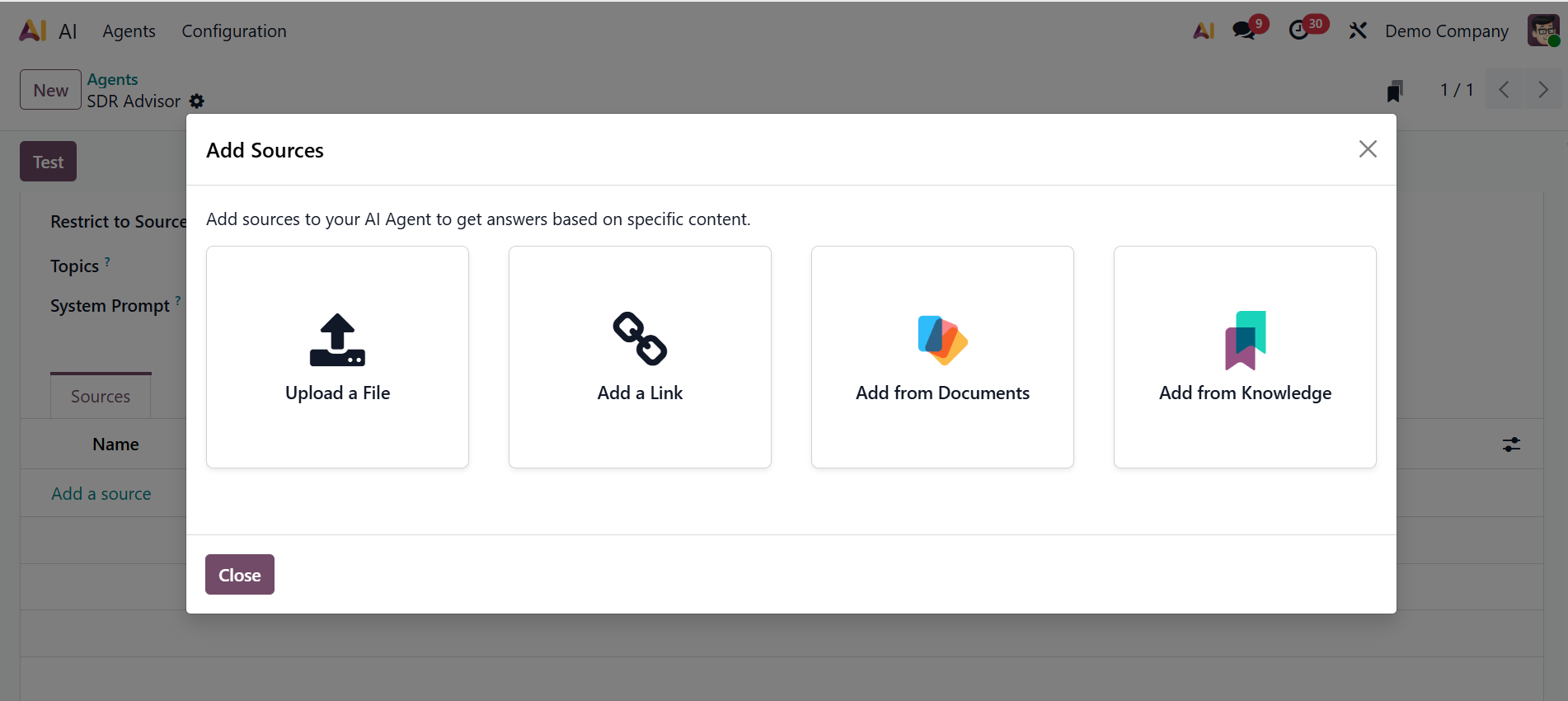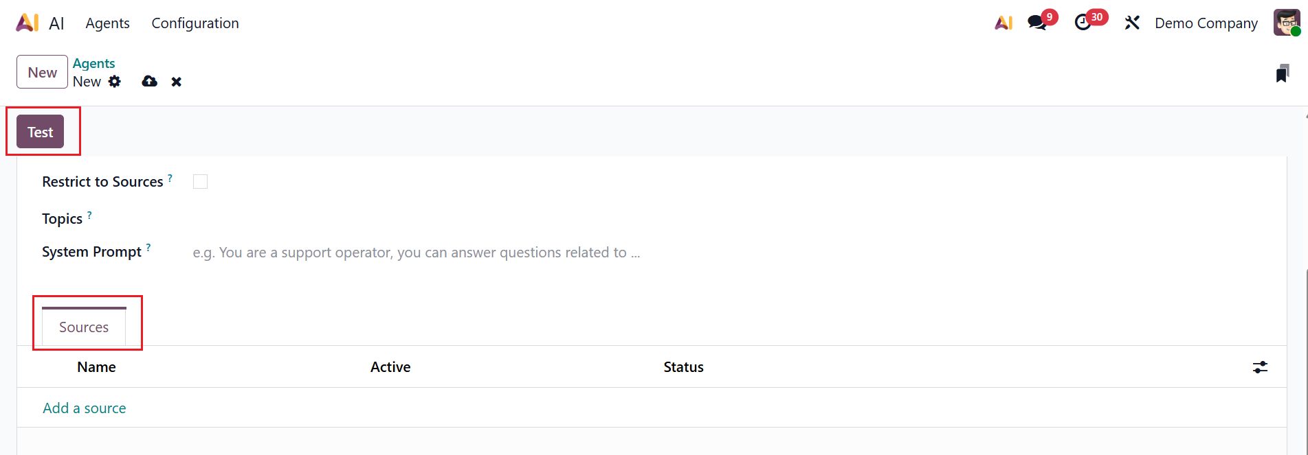 Under the Sources tab, click the Add a source button to add sources for the agent.