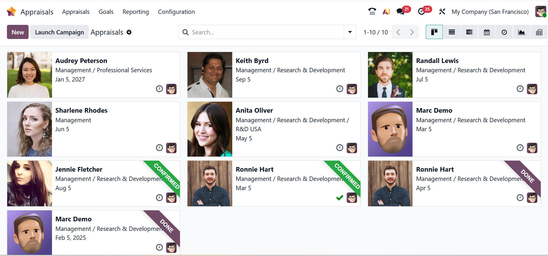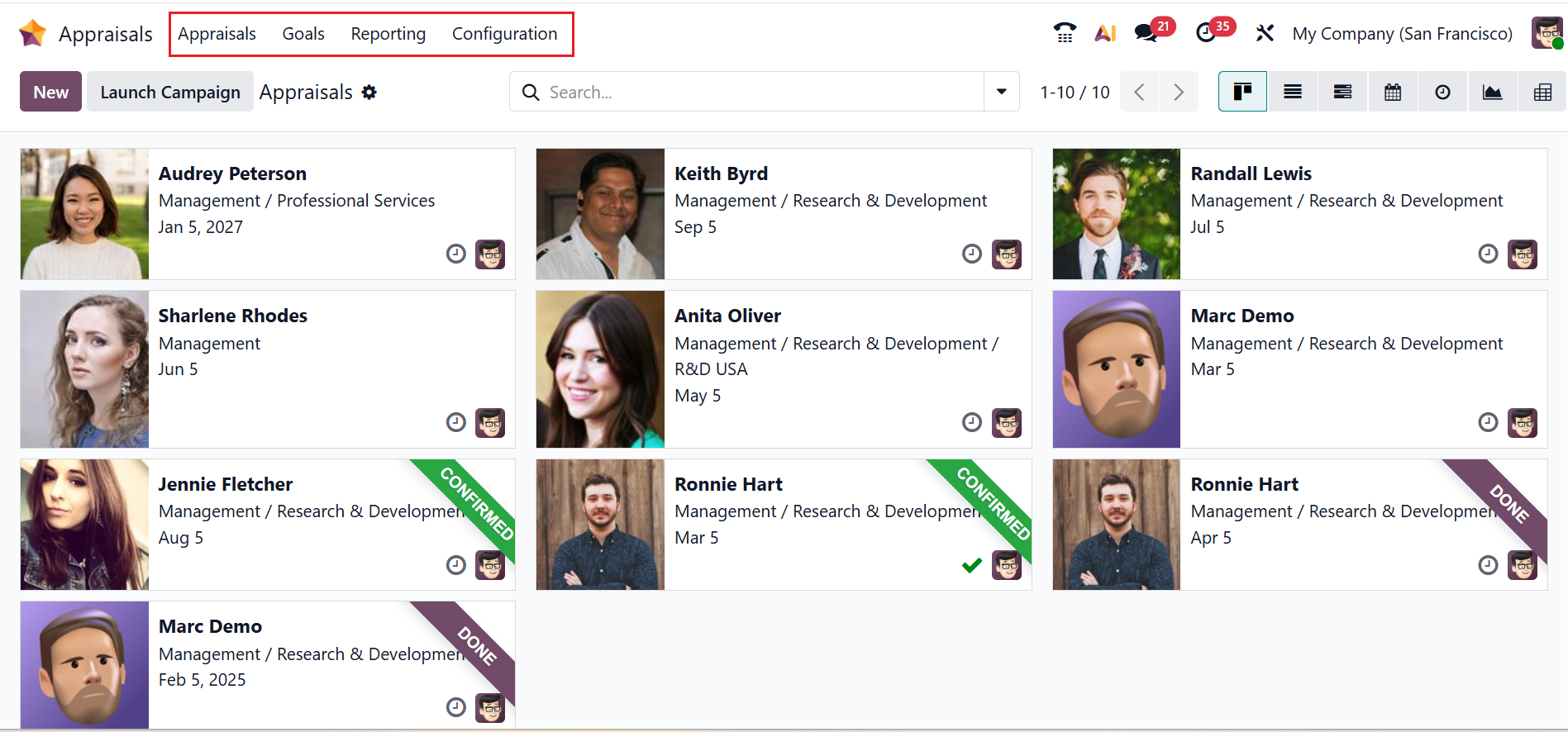 By default, the Appraisals menu displays the main dashboard of the Appraisals module. In a Kanban view, each employee profile is arranged as a Kanban card with details, including name, department, date, appraiser, and schedule activity icon.