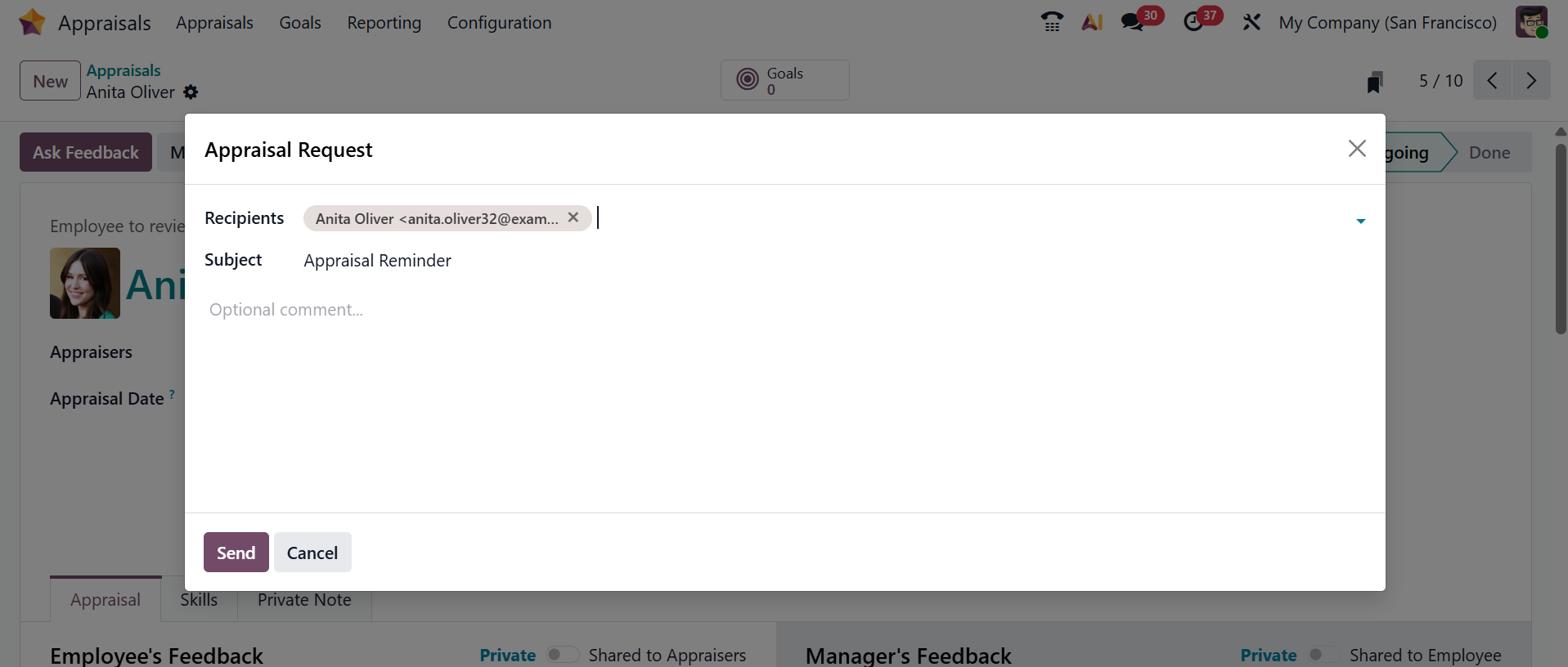 Clicking the Send by Email button will open a new pop-up screen, as shown below. Here, the manager can directly send the appraisal form or request to the employee.