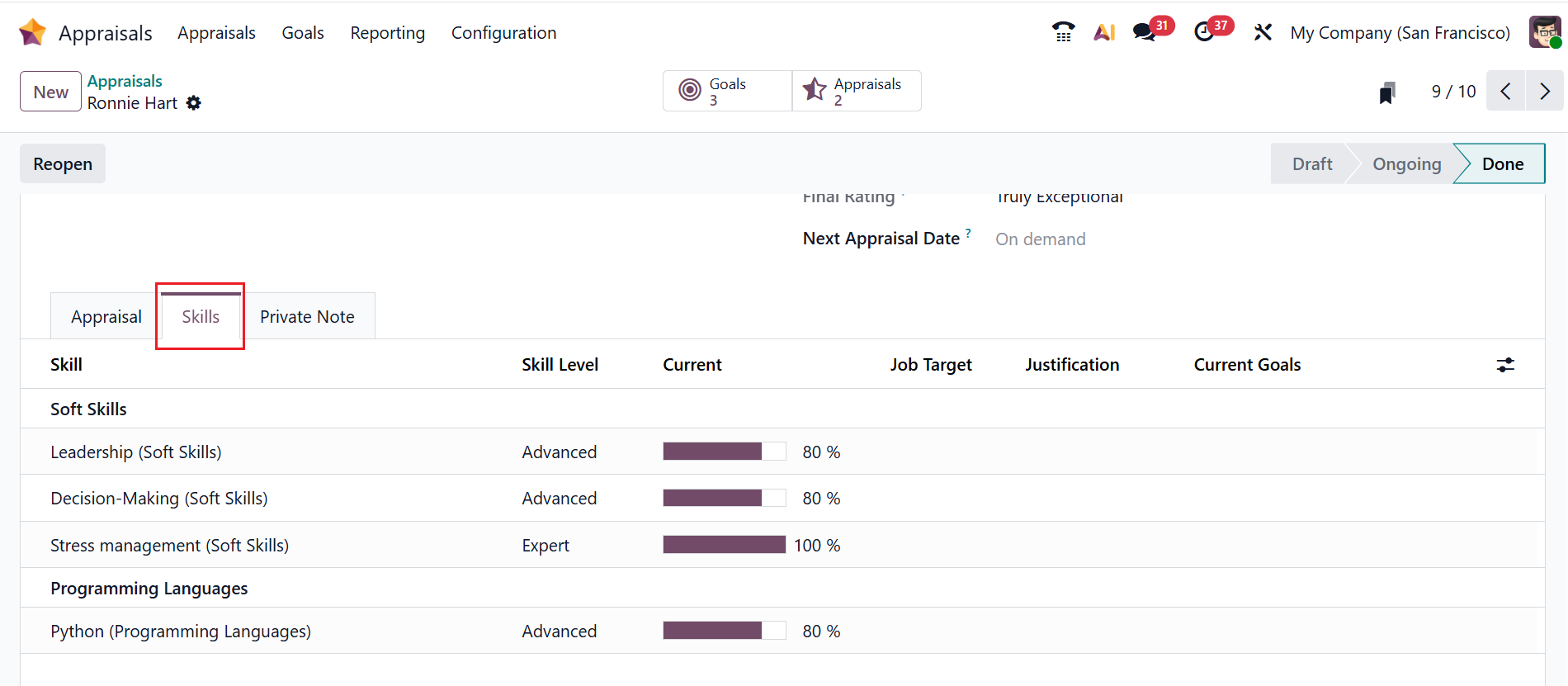 After confirming the appraisal, a new tab will appear named Skills, as shown below. Under the Skills tab, you can view the employee’s skills and their level.