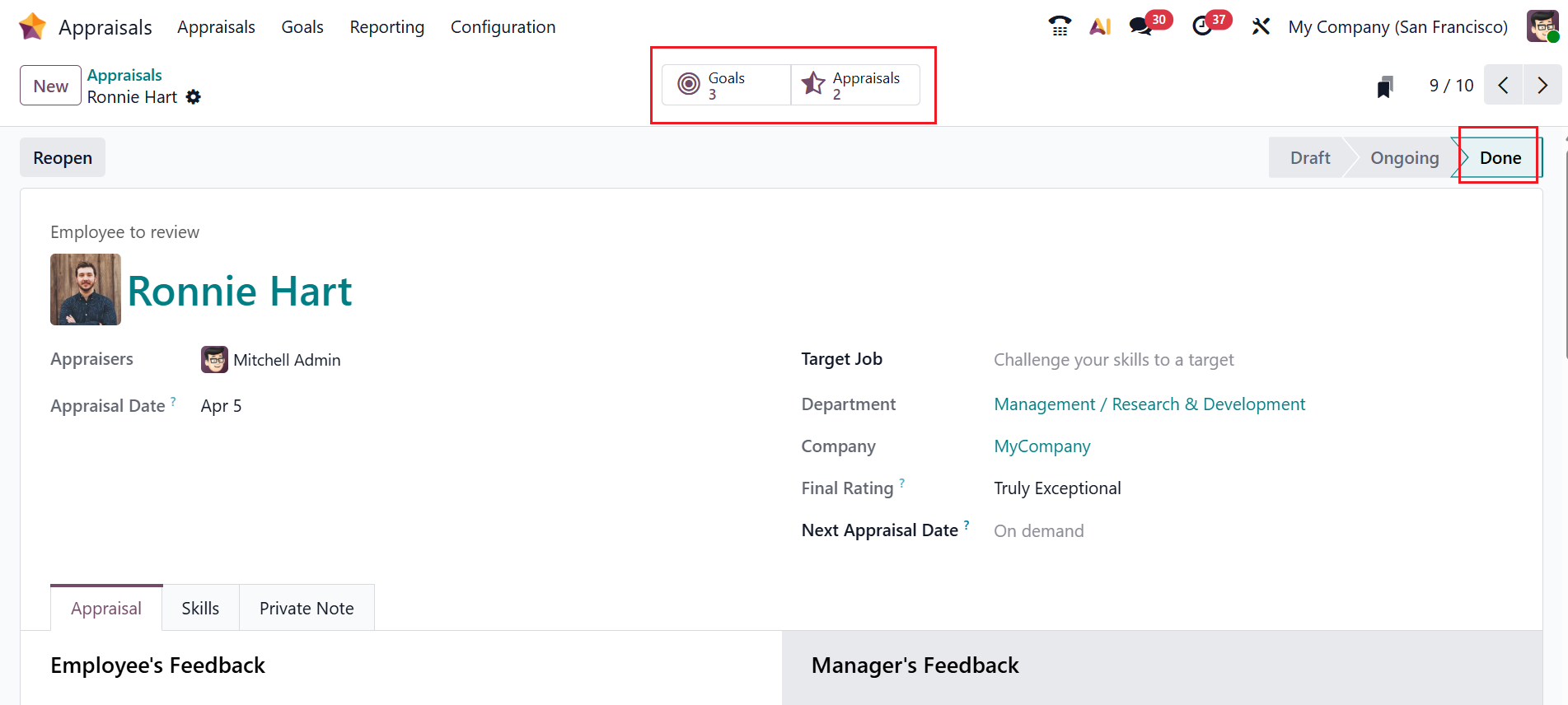 Use the Mark as Done button to close the appraisal once all evaluations and discussions are completed. You can also reopen a completed or closed appraisal using the Reset button.