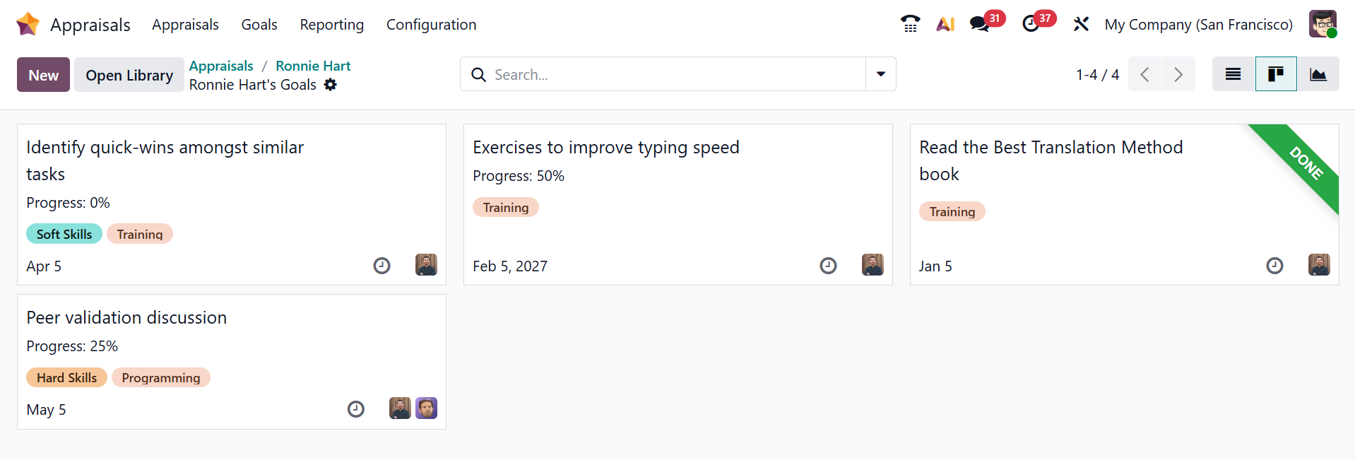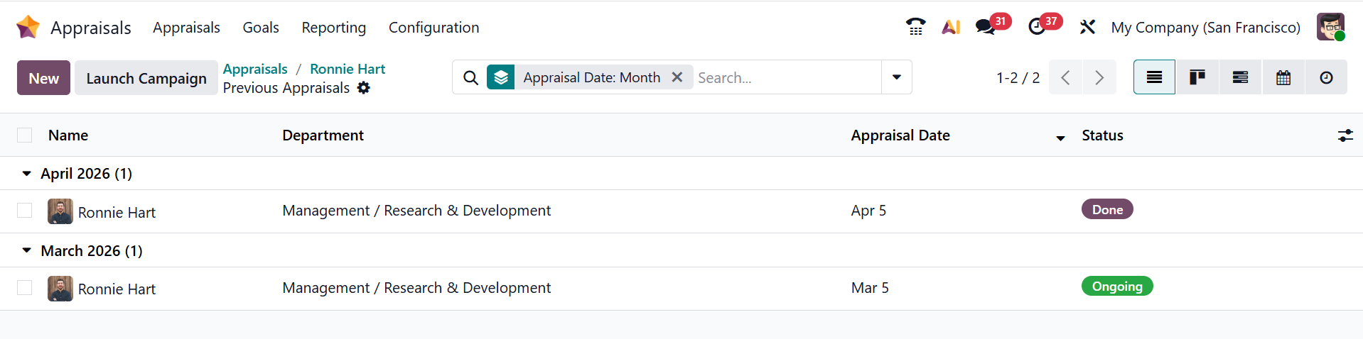 In the Appraisals module, you can see four menus: Appraisals, Goals, Reporting, and Configuration.