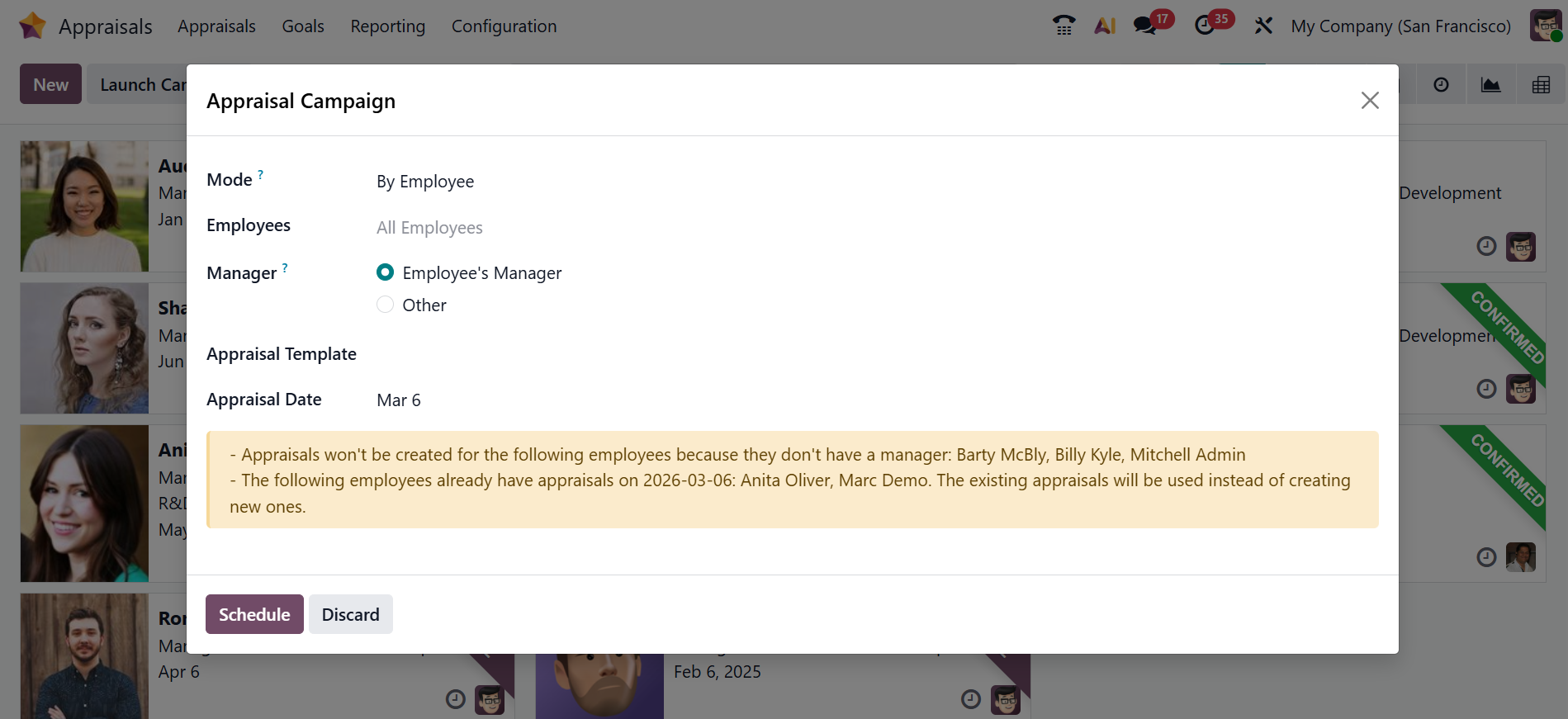 Clicking the Launch Campaign button will open a new pop-up window, as shown below. In the Mode field, you can create appraisals in batches based on By Employee, By Company, By Department, and By Company Tag. In the Employees field, select employees for the appraisal campaign. Select the Manager as the Employee’s Manager (appraisals will be conducted by the direct manager of the employee) or Other (appraisals will be conducted by the specified employees). Select an Appraisal Template and Appraisal Date for the campaign. Then, click on the Schedule button.