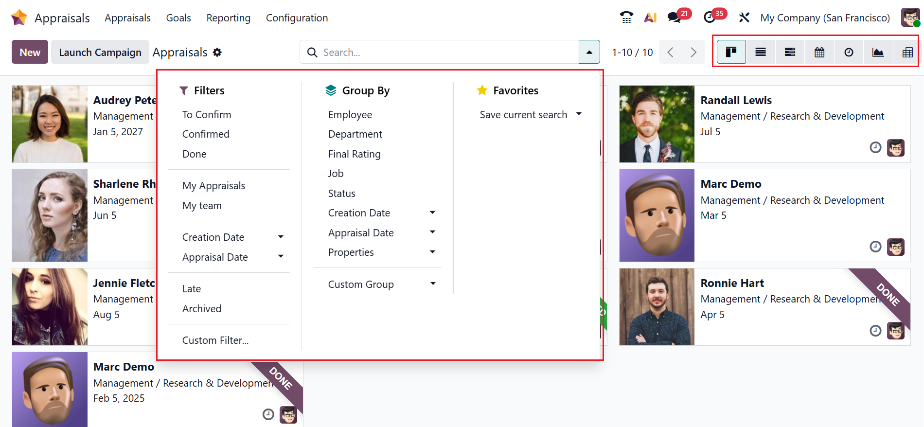 Click on the drop-down menu in the search bar to view options such as Filters, Group By, and Favorites. You can filter the data based on To Confirm, Confirmed, Done, My Appraisals, My team, Creation Date, Appraisal Date, Late, Archived, and to add a customized filter, use the Custom Filter option. You can group the data based on Employee, Department, Final Rating, Job, Status, Creation Date, Appraisal Date, Properties, and to customize a group, use the Custom Group option. You can also save the current search under the Favorites option. From the Kanban view, you can also change the view into List, Gantt, Calendar, Activity, Graph, or Pivot.
