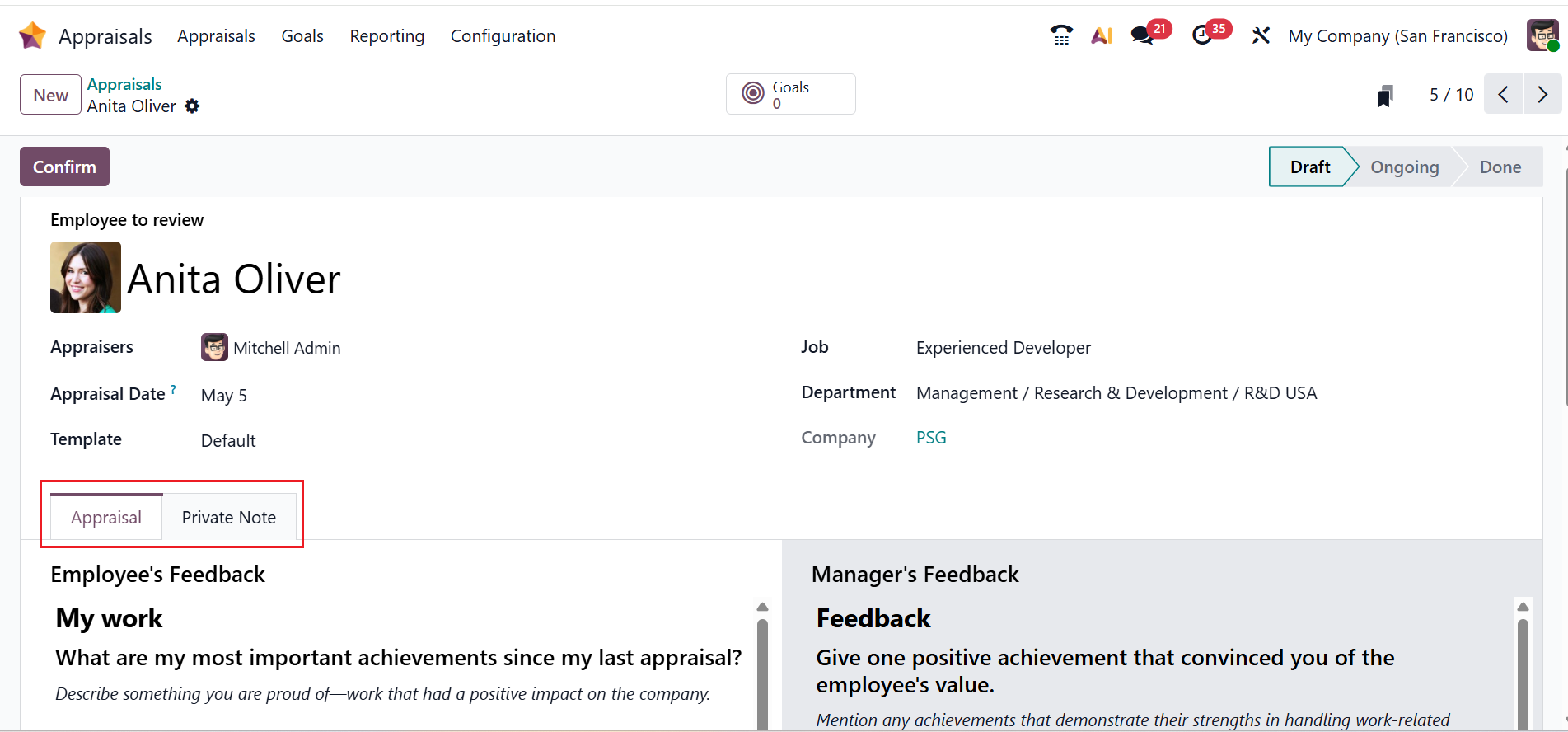 Under the Appraisals tab, you can view two sections with Employee’s Feedback and Manager’s Feedback. Under the Private Note tab, the managers can add a private note that is accessible to selected people only. To verify the employee evaluation, click on the Confirm button as shown below: