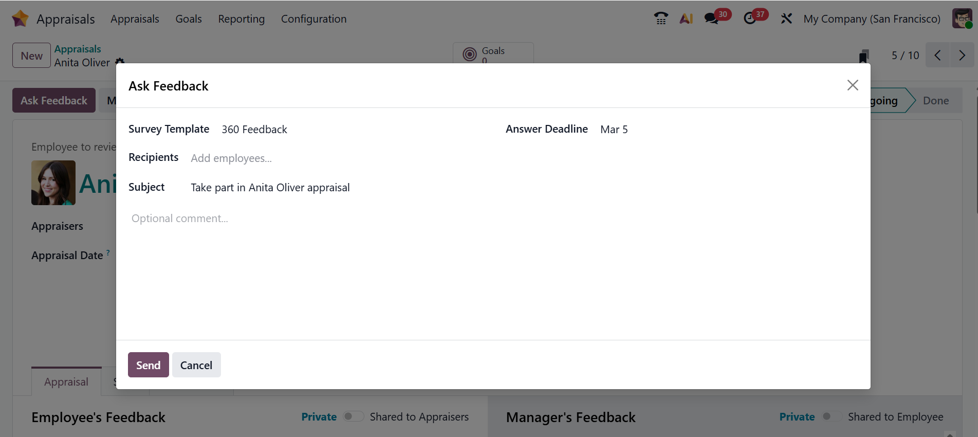 An email pop-up window will then be displayed, as illustrated below. The Survey Template, Subject, and the Answer Deadline options will be automatically filled based on the appraisal form. In the Recipients field, select the employees being asked to provide feedback. Next, enter your message and click the Send button.