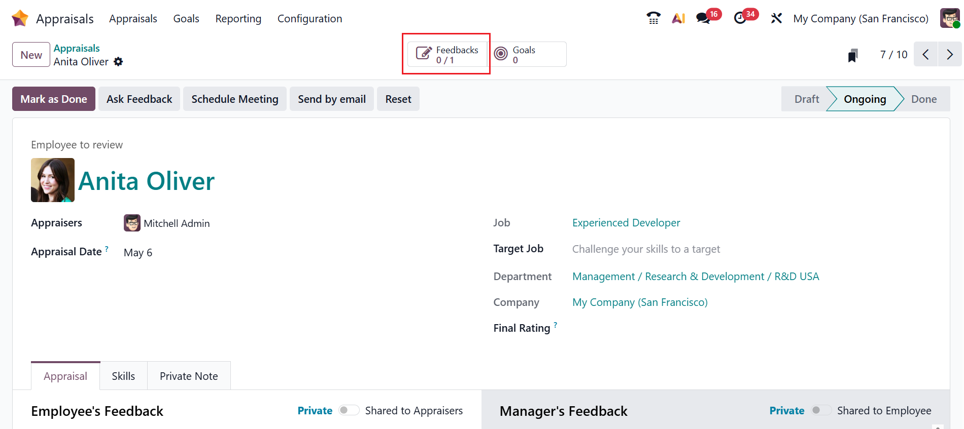 From the Draft stage, the appraisal moves to the Ongoing stage. Here, you can see new options after confirming the appraisal, such as Ask Feedback, Mark as Done, Schedule Meeting, Send by email, and Reset. To enquire feedback from the co-workers, click on the Ask Feedback button. This Ask Feedback button is available only after enabling the 360 Feedback from Settings.