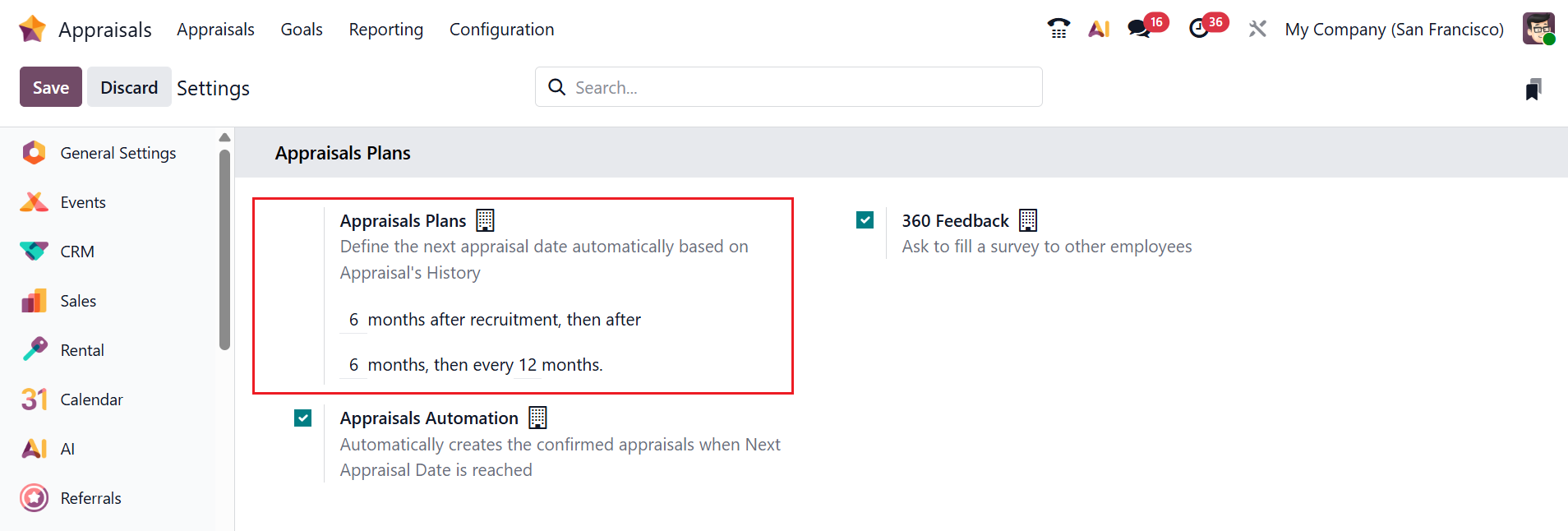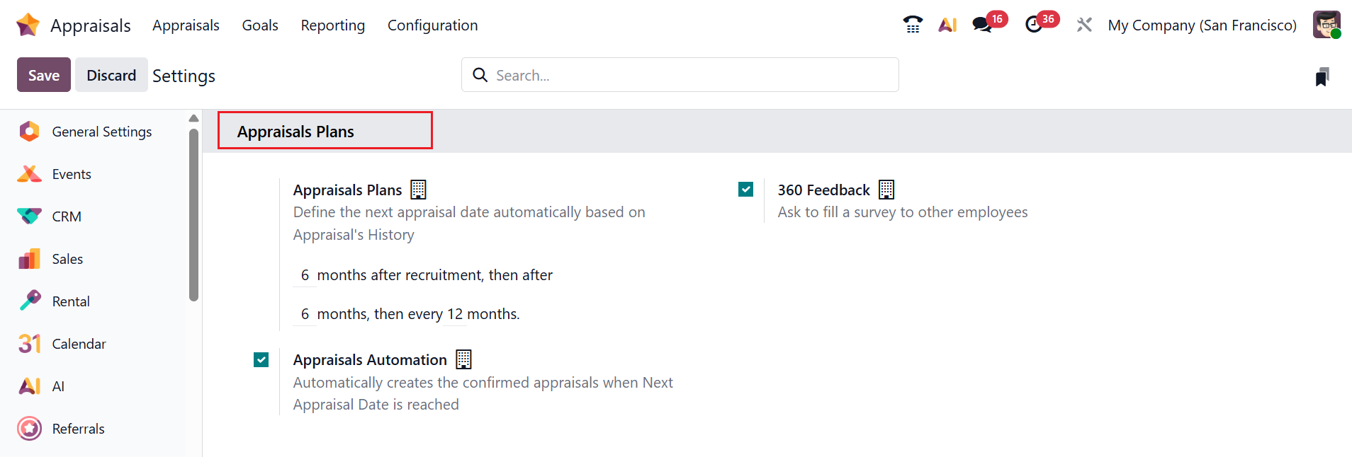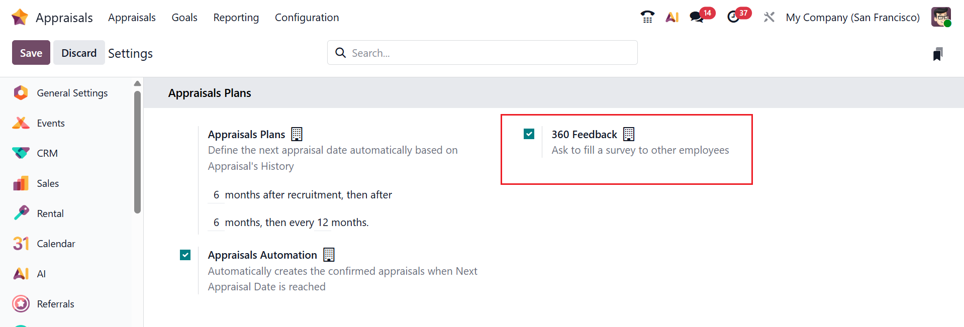 In Odoo 19 Appraisals, the Settings option allows administrators to enable and customize appraisal features for the company. These settings help tailor the appraisal process to match your organization’s performance review policy. Under the Appraisals Plans section, you can see three options: Appraisals Plans, 360 Feedback, and Appraisals Automation.