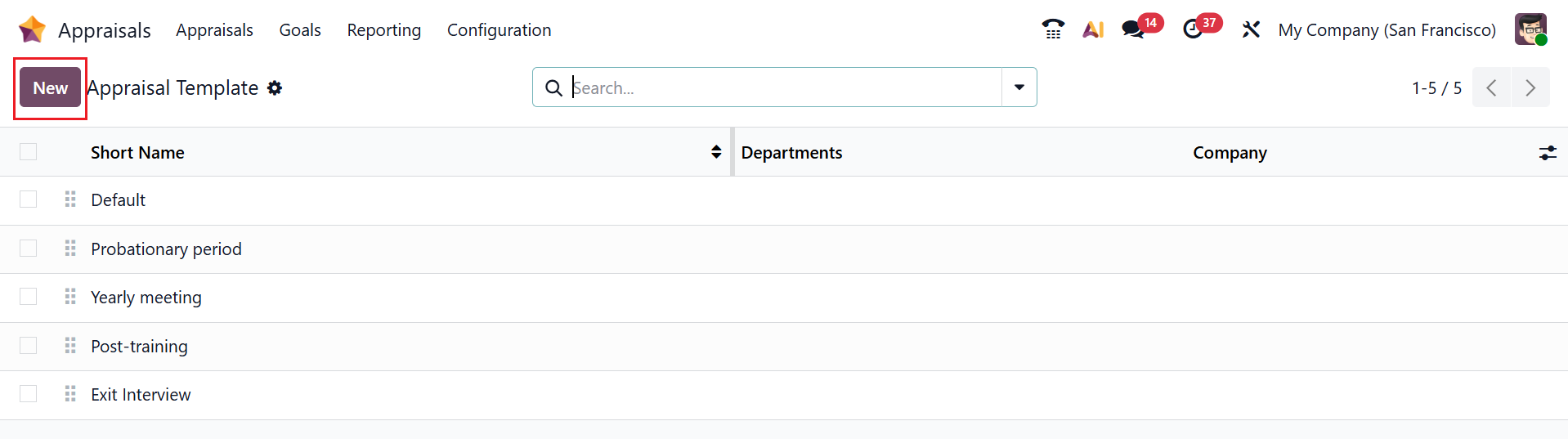 In Odoo 19, the Appraisal Template provides customizable templates that define evaluation forms used to assess employee performance. These features enable HR teams to standardize and automate performance reviews throughout the organization. Here, you can see a list of appraisal templates with details such as Short Name, Description, and Company. To create a new appraisal template, click the New button.