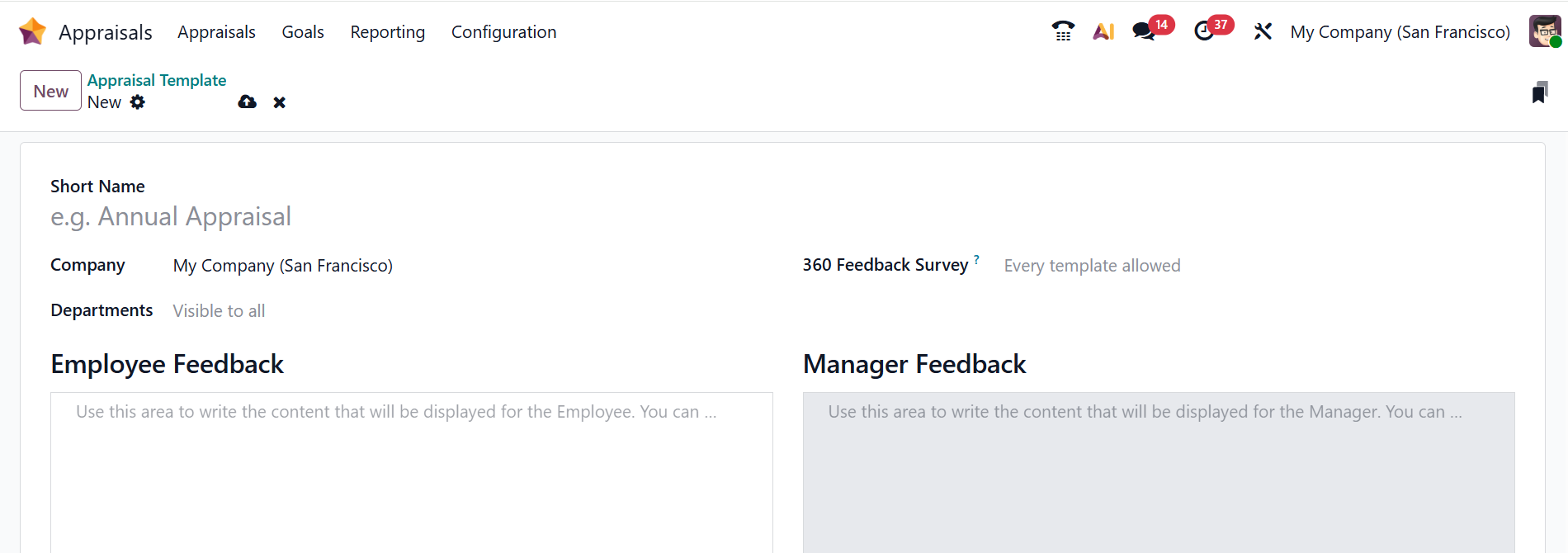 Here, add the details for the new appraisal template, such as Short Name, Company, Departments, 360 Feedback Survey, Employee Feedback, and Manager Feedback