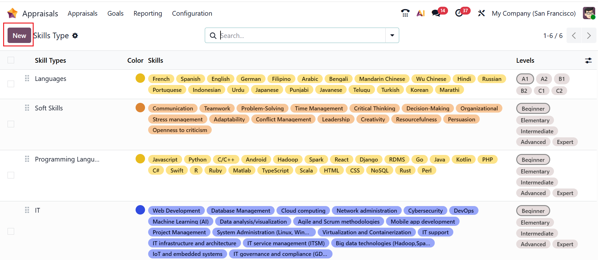 In Odoo 19 Appraisals, Skill Types are categories used to group employees for evaluation based on their skills. They help to structure appraisal forms by organizing individual skills under broader competency areas. This makes performance reviews clearer, more consistent, and easier to analyze across employees and departments. Here, you can see a list of skills with details such as Skill Types, Color, Skills, and Levels. Click the New button to create a new skill type.