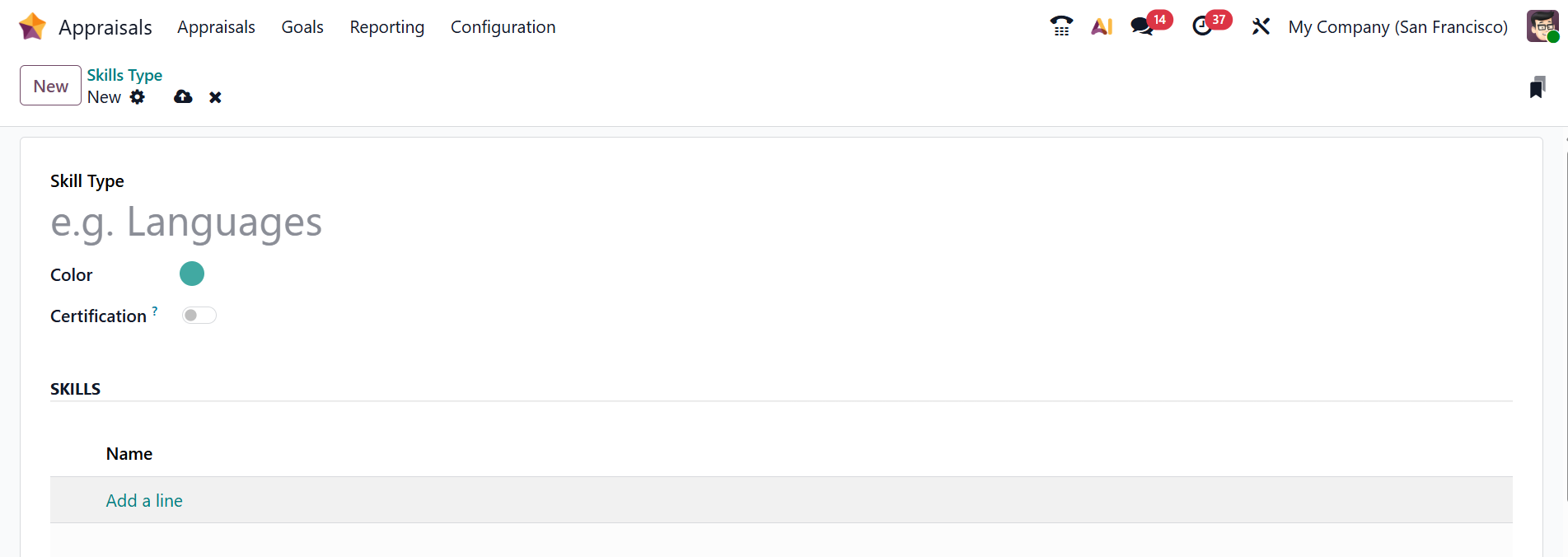Here, add a name for the skill type under the Skill Type and select a color. Enable the Certifications option for the skill type. Under the Skills section, you can add skills by clicking on the Add a line button.