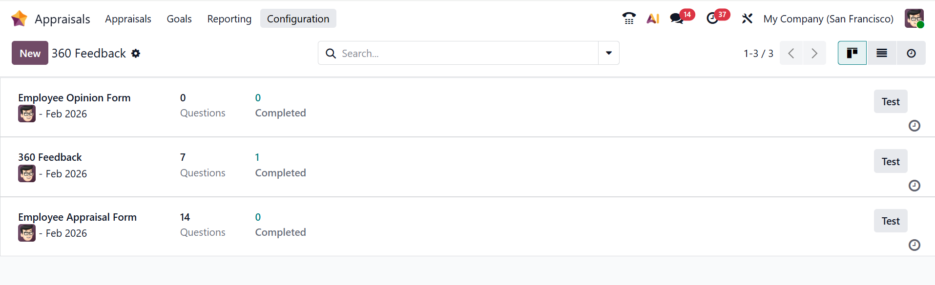 In Odoo 19 Appraisals, 360 Feedback is a performance evaluation method where feedback about an employee is collected from multiple sources, such as managers, peers, subordinates, and sometimes the employee themselves. It offers a comprehensive view of performance by evaluating skills, behaviors, and competencies from multiple perspectives. This approach helps identify strengths, improvement areas, and supports more balanced and objective appraisals.