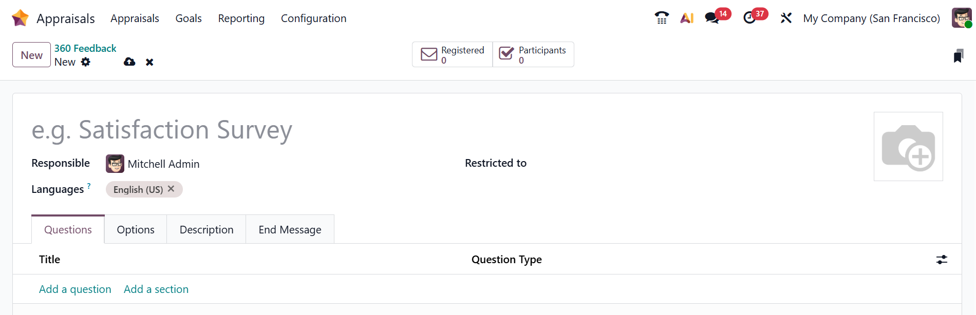 Enter a name in the Survey Name field. In the Responsible field, select an employee responsible for the survey. You can also restrict any particular person from the survey in the Restricted to field. Under the Questions tab, click on the Add a question button to add questions to the survey. A new pop-up window will appear, allowing you to enter the question and choose the question type. Under the Options tab, you can manage the questions and participants. Enter the survey details under the Description tab. Under the End Message tab, add a message that will display when the survey is completed.