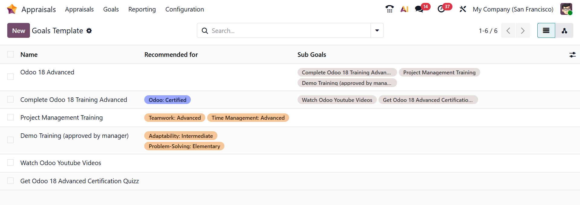 In the Odoo 19 Appraisals, the Library dashboard shows a list of goal templates that allow HR managers to create predefined performance objectives that can be reused across employees or departments. These templates help standardize goal setting, ensure alignment with company objectives, and make it easier to assign, track, and evaluate employee performance consistently. Here, you can see the details of goal templates, such as Name, Recommended for, and Sub Goals. Click the New button to create a new goal template.