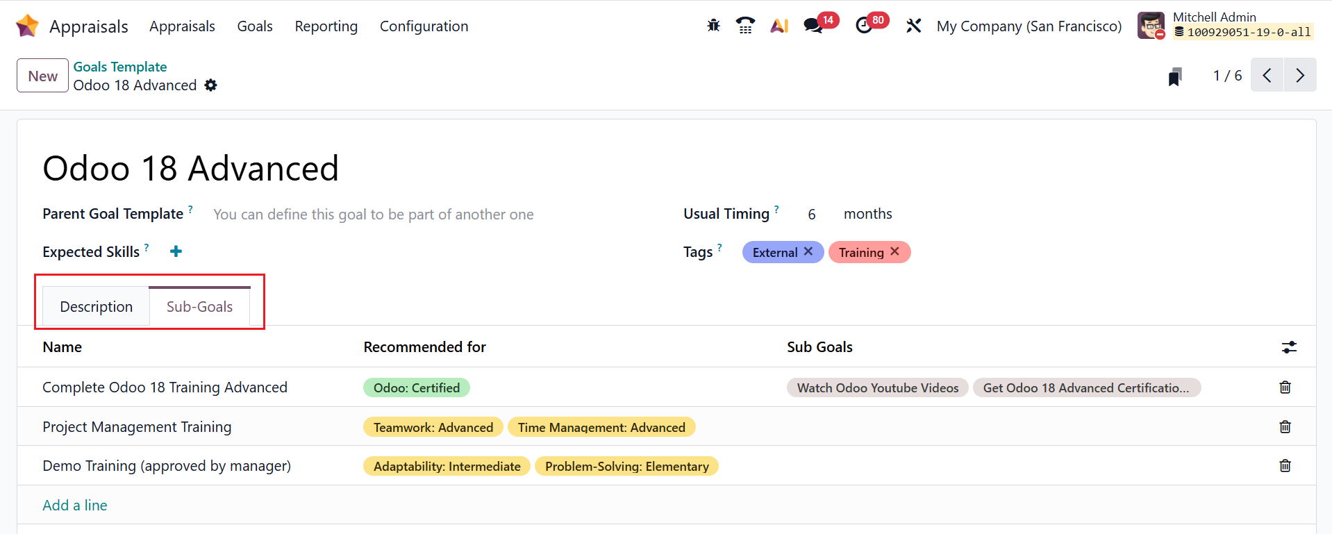 Here, add a name for the goal template and select a parent goal template. In the Usual Timing field, select the average timing to complete the goal. In the Expected Skills field, select the skills recommended for the goal. You can add appropriate tags for the goal template. Under the Description tab, add the information about the goal. Under the Sub-Goal tab, click on the Add a line button to add sub-goal templates to the goal.