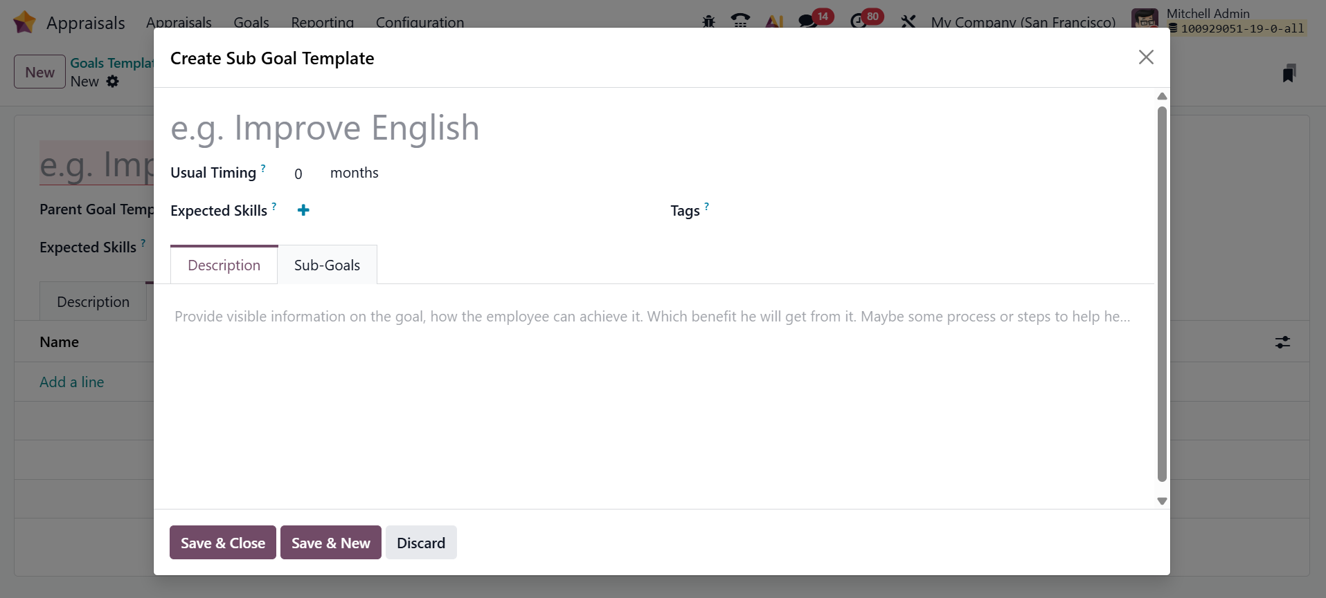 A new pop-up window will appear where you can add the details of the sub-goal template, such as Name, Usual Timing, Expected Skills, Description, and Sub-Goals, as shown below: