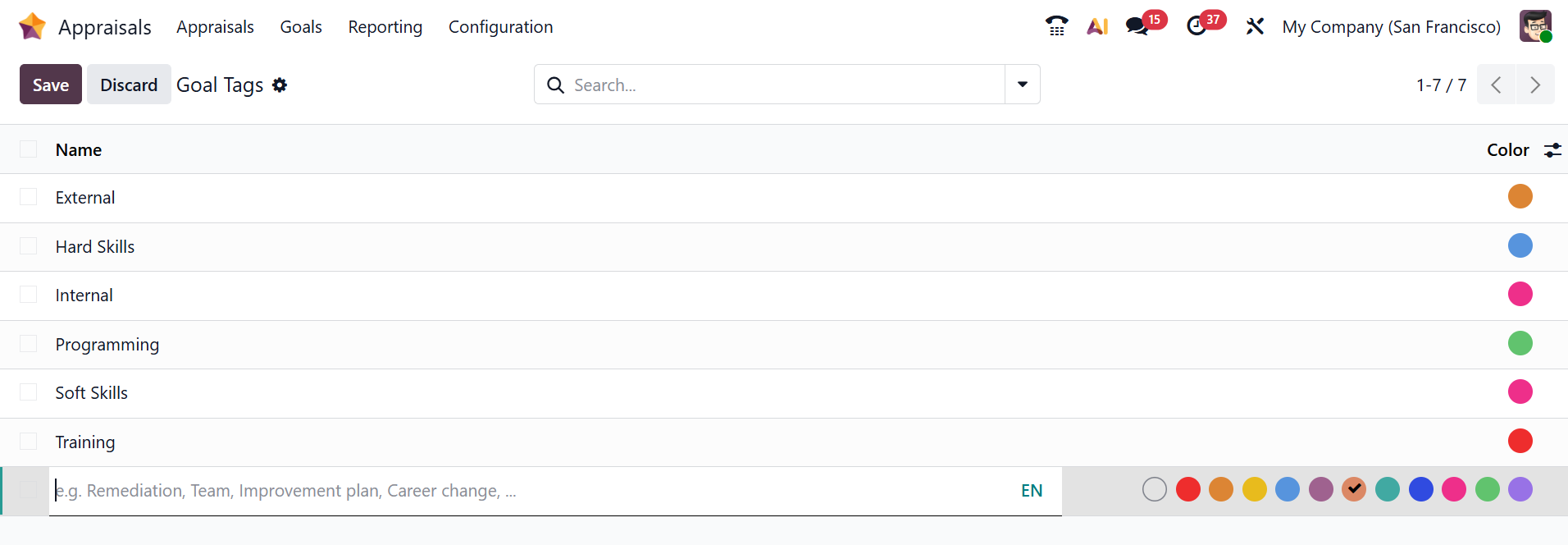 In Odoo 19 Appraisals, Goal Tags are used to categorize and organize employee goals based on specific themes such as skills, departments, or performance areas. They make it easier to filter, track, and analyze goals across different employees, ensuring better alignment and structured performance management. To add a new tag, click on the New button, and a new line will appear where you can add the name and color for the tag and save it.