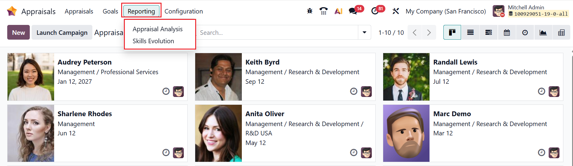 In Odoo 19 Appraisals, the Reporting feature provides analytical views of employee performance data, appraisal statuses, and goal progress. Under the Reporting menu, you can see two options: Appraisal Analysis and Skills Evolution.