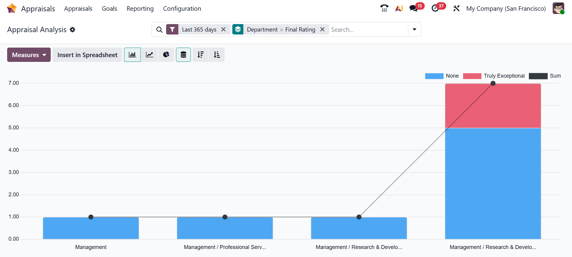 In Odoo 19 Appraisals, Appraisals Analysis provides detailed reporting on evaluation results, appraisal statuses, and employee performance trends. The X-axis shows the departments, and the Y-axis shows the total number of appraisals in each department. You can view the appraisal analysis as a bar chart, line chart, pie chart, stacked, descending, or ascending.