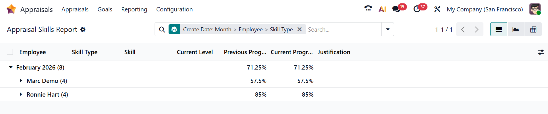 Here, you can see a list of appraisal skill reports with details such as Employee, Skill Type, Skill, Current Level, Previous Progress, Current Progress, and Justification.