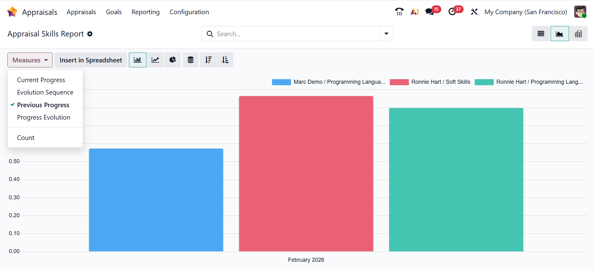 This section displays the appraisal skills report in a graphical format. The X-axis shows the appraisal skills, and the Y-axis shows the level of progress. Click the Measures button to change the metrics to Current Progress, Evolution Sequence, Previous Progress, Progress Evolution, or Count.